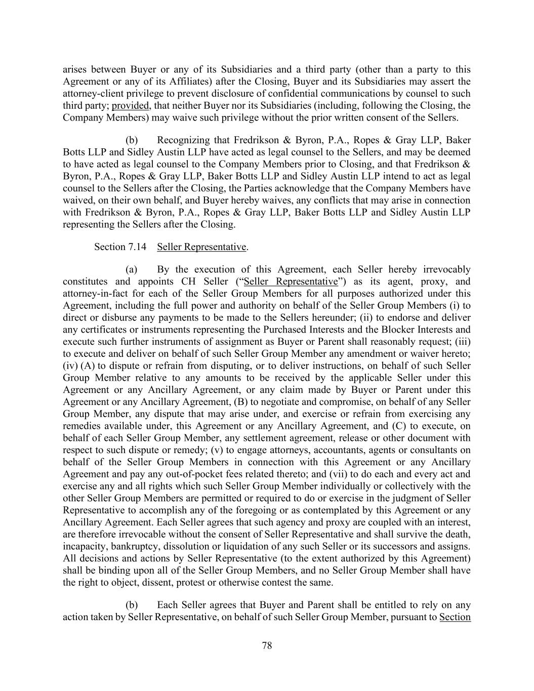 78 arises between Buyer or any of its Subsidiaries and a third party (other than a party to this Agreement or any of its Affiliates) after the Closing, Buyer and its Subsidiaries may assert the attorney-client privilege to prevent disclosure of confidential communications by counsel to such third party; provided, that neither Buyer nor its Subsidiaries (including, following the Closing, the Company Members) may waive such privilege without the prior written consent of the Sellers. (b) Recognizing that Fredrikson & Byron, P.A., Ropes & Gray LLP, Baker Botts LLP and Sidley Austin LLP have acted as legal counsel to the Sellers, and may be deemed to have acted as legal counsel to the Company Members prior to Closing, and that Fredrikson & Byron, P.A., Ropes & Gray LLP, Baker Botts LLP and Sidley Austin LLP intend to act as legal counsel to the Sellers after the Closing, the Parties acknowledge that the Company Members have waived, on their own behalf, and Buyer hereby waives, any conflicts that may arise in connection with Fredrikson & Byron, P.A., Ropes & Gray LLP, Baker Botts LLP and Sidley Austin LLP representing the Sellers after the Closing. Section 7.14 Seller Representative. (a) By the execution of this Agreement, each Seller hereby irrevocably constitutes and appoints CH Seller (“Seller Representative”) as its agent, proxy, and attorney-in-fact for each of the Seller Group Members for all purposes authorized under this Agreement, including the full power and authority on behalf of the Seller Group Members (i) to direct or disburse any payments to be made to the Sellers hereunder; (ii) to endorse and deliver any certificates or instruments representing the Purchased Interests and the Blocker Interests and execute such further instruments of assignment as Buyer or Parent shall reasonably request; (iii) to execute and deliver on behalf of such Seller Group Member any amendment or waiver hereto; (iv) (A) to dispute or refrain from disputing, or to deliver instructions, on behalf of such Seller Group Member relative to any amounts to be received by the applicable Seller under this Agreement or any Ancillary Agreement, or any claim made by Buyer or Parent under this Agreement or any Ancillary Agreement, (B) to negotiate and compromise, on behalf of any Seller Group Member, any dispute that may arise under, and exercise or refrain from exercising any remedies available under, this Agreement or any Ancillary Agreement, and (C) to execute, on behalf of each Seller Group Member, any settlement agreement, release or other document with respect to such dispute or remedy; (v) to engage attorneys, accountants, agents or consultants on behalf of the Seller Group Members in connection with this Agreement or any Ancillary Agreement and pay any out-of-pocket fees related thereto; and (vii) to do each and every act and exercise any and all rights which such Seller Group Member individually or collectively with the other Seller Group Members are permitted or required to do or exercise in the judgment of Seller Representative to accomplish any of the foregoing or as contemplated by this Agreement or any Ancillary Agreement. Each Seller agrees that such agency and proxy are coupled with an interest, are therefore irrevocable without the consent of Seller Representative and shall survive the death, incapacity, bankruptcy, dissolution or liquidation of any such Seller or its successors and assigns. All decisions and actions by Seller Representative (to the extent authorized by this Agreement) shall be binding upon all of the Seller Group Members, and no Seller Group Member shall have the right to object, dissent, protest or otherwise contest the same. (b) Each Seller agrees that Buyer and Parent shall be entitled to rely on any action taken by Seller Representative, on behalf of such Seller Group Member, pursuant to Section