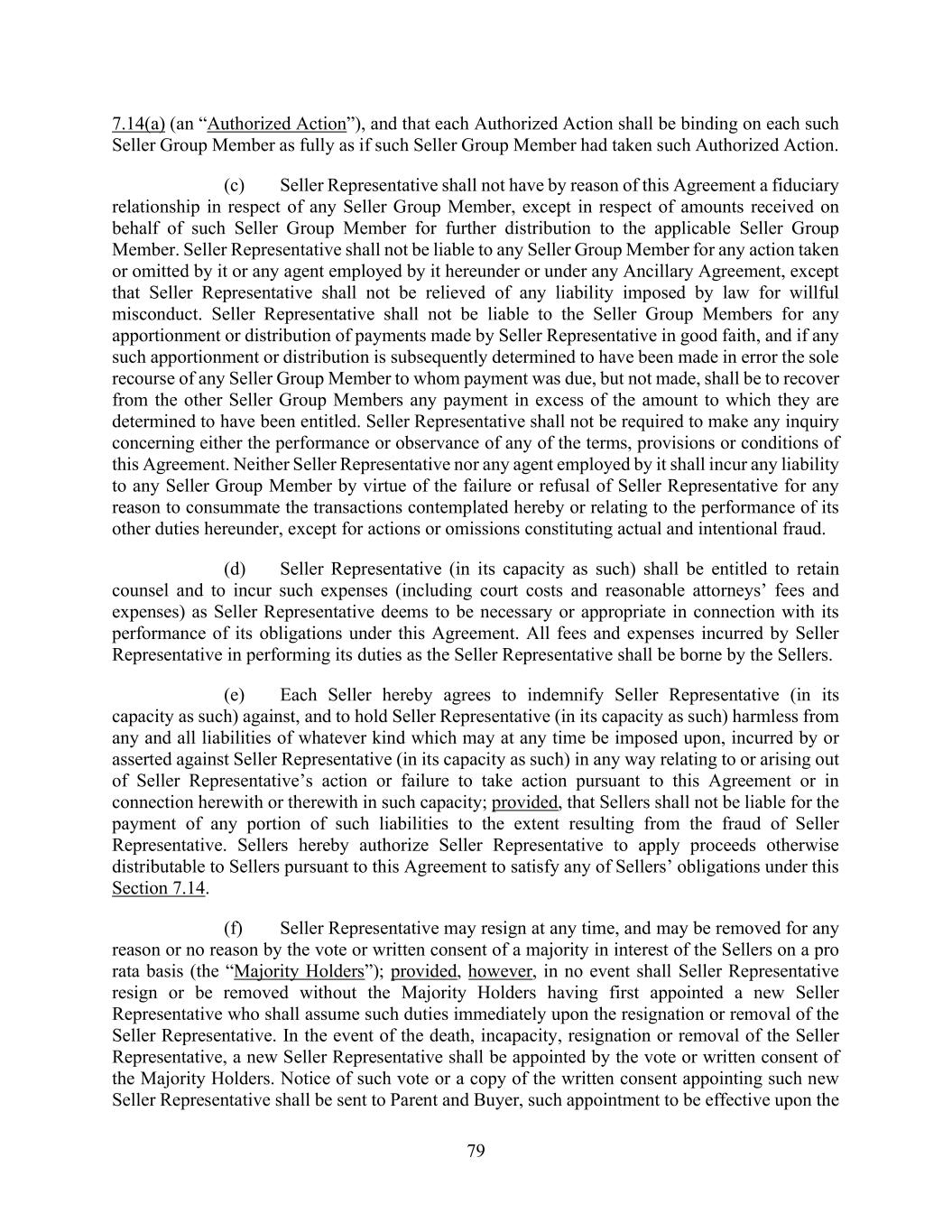 79 7.14(a) (an “Authorized Action”), and that each Authorized Action shall be binding on each such Seller Group Member as fully as if such Seller Group Member had taken such Authorized Action. (c) Seller Representative shall not have by reason of this Agreement a fiduciary relationship in respect of any Seller Group Member, except in respect of amounts received on behalf of such Seller Group Member for further distribution to the applicable Seller Group Member. Seller Representative shall not be liable to any Seller Group Member for any action taken or omitted by it or any agent employed by it hereunder or under any Ancillary Agreement, except that Seller Representative shall not be relieved of any liability imposed by law for willful misconduct. Seller Representative shall not be liable to the Seller Group Members for any apportionment or distribution of payments made by Seller Representative in good faith, and if any such apportionment or distribution is subsequently determined to have been made in error the sole recourse of any Seller Group Member to whom payment was due, but not made, shall be to recover from the other Seller Group Members any payment in excess of the amount to which they are determined to have been entitled. Seller Representative shall not be required to make any inquiry concerning either the performance or observance of any of the terms, provisions or conditions of this Agreement. Neither Seller Representative nor any agent employed by it shall incur any liability to any Seller Group Member by virtue of the failure or refusal of Seller Representative for any reason to consummate the transactions contemplated hereby or relating to the performance of its other duties hereunder, except for actions or omissions constituting actual and intentional fraud. (d) Seller Representative (in its capacity as such) shall be entitled to retain counsel and to incur such expenses (including court costs and reasonable attorneys’ fees and expenses) as Seller Representative deems to be necessary or appropriate in connection with its performance of its obligations under this Agreement. All fees and expenses incurred by Seller Representative in performing its duties as the Seller Representative shall be borne by the Sellers. (e) Each Seller hereby agrees to indemnify Seller Representative (in its capacity as such) against, and to hold Seller Representative (in its capacity as such) harmless from any and all liabilities of whatever kind which may at any time be imposed upon, incurred by or asserted against Seller Representative (in its capacity as such) in any way relating to or arising out of Seller Representative’s action or failure to take action pursuant to this Agreement or in connection herewith or therewith in such capacity; provided, that Sellers shall not be liable for the payment of any portion of such liabilities to the extent resulting from the fraud of Seller Representative. Sellers hereby authorize Seller Representative to apply proceeds otherwise distributable to Sellers pursuant to this Agreement to satisfy any of Sellers’ obligations under this Section 7.14. (f) Seller Representative may resign at any time, and may be removed for any reason or no reason by the vote or written consent of a majority in interest of the Sellers on a pro rata basis (the “Majority Holders”); provided, however, in no event shall Seller Representative resign or be removed without the Majority Holders having first appointed a new Seller Representative who shall assume such duties immediately upon the resignation or removal of the Seller Representative. In the event of the death, incapacity, resignation or removal of the Seller Representative, a new Seller Representative shall be appointed by the vote or written consent of the Majority Holders. Notice of such vote or a copy of the written consent appointing such new Seller Representative shall be sent to Parent and Buyer, such appointment to be effective upon the