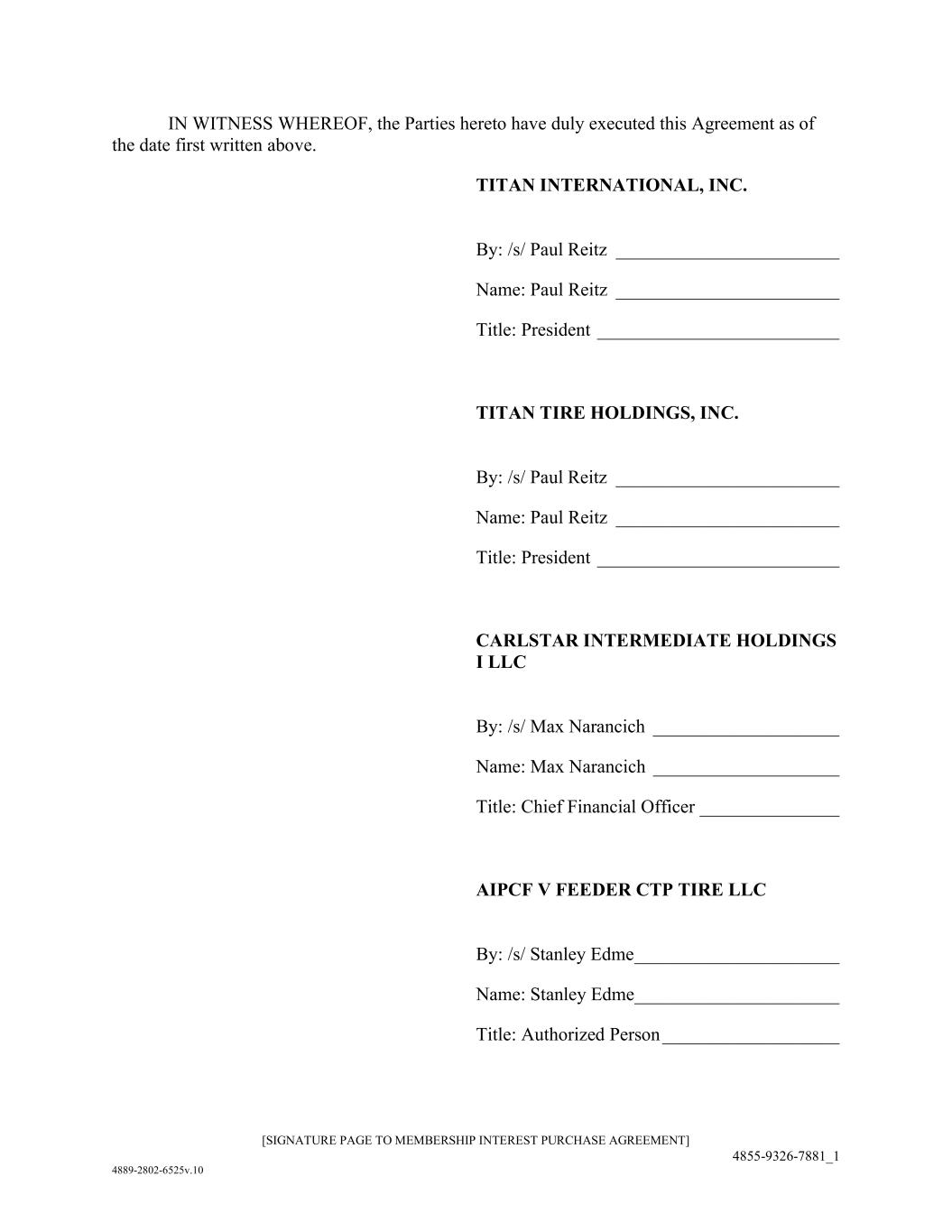 [SIGNATURE PAGE TO MEMBERSHIP INTEREST PURCHASE AGREEMENT] 4855-9326-7881_1 4889-2802-6525v.10 IN WITNESS WHEREOF, the Parties hereto have duly executed this Agreement as of the date first written above. TITAN INTERNATIONAL, INC. By: /s/ Paul Reitz ________________________ Name: Paul Reitz ________________________ Title: President __________________________ TITAN TIRE HOLDINGS, INC. By: /s/ Paul Reitz ________________________ Name: Paul Reitz ________________________ Title: President __________________________ CARLSTAR INTERMEDIATE HOLDINGS I LLC By: /s/ Max Narancich ____________________ Name: Max Narancich ____________________ Title: Chief Financial Officer _______________ AIPCF V FEEDER CTP TIRE LLC By: /s/ Stanley Edme ______________________ Name: Stanley Edme______________________ Title: Authorized Person ___________________