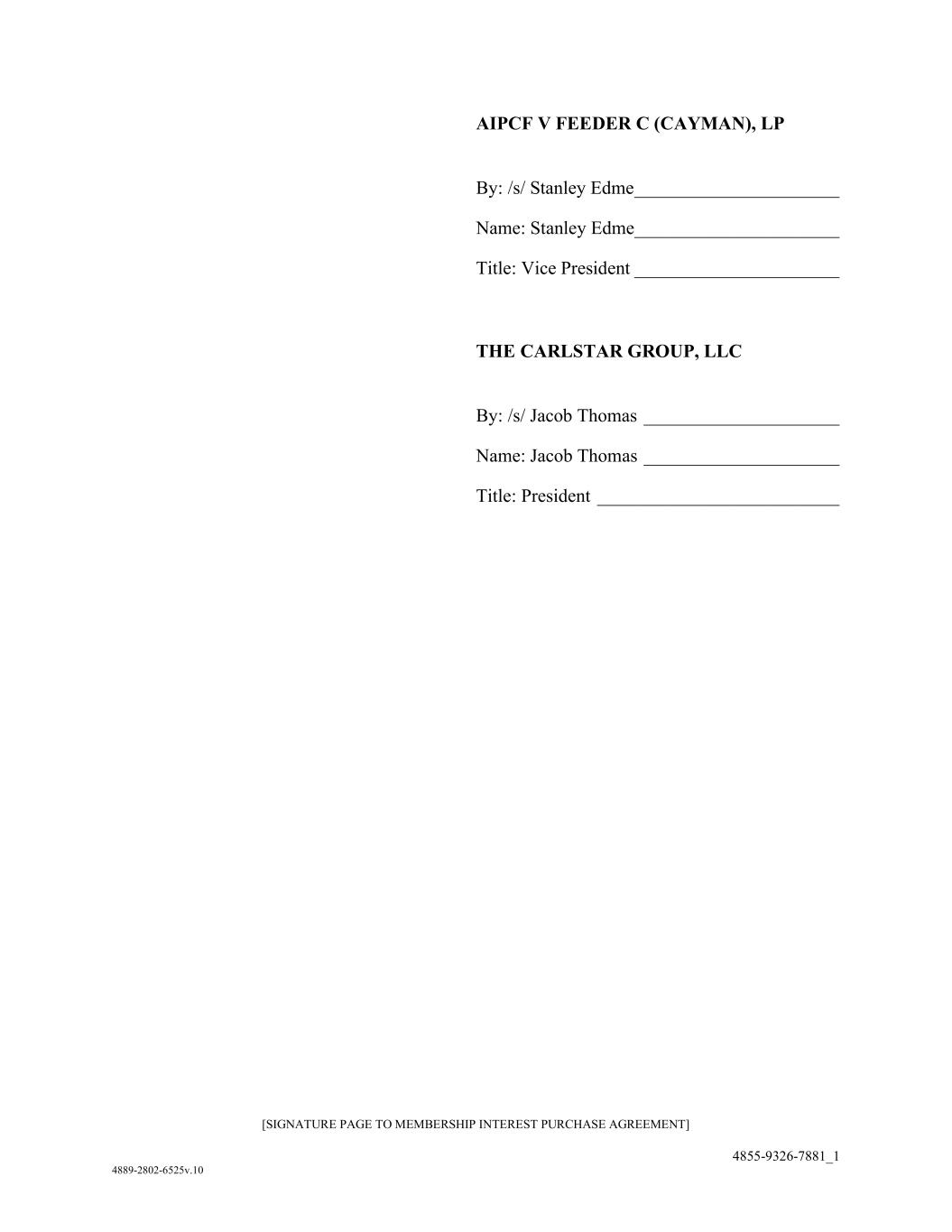 [SIGNATURE PAGE TO MEMBERSHIP INTEREST PURCHASE AGREEMENT] 4855-9326-7881_1 4889-2802-6525v.10 AIPCF V FEEDER C (CAYMAN), LP By: /s/ Stanley Edme ______________________ Name: Stanley Edme______________________ Title: Vice President ______________________ THE CARLSTAR GROUP, LLC By: /s/ Jacob Thomas _____________________ Name: Jacob Thomas _____________________ Title: President __________________________
