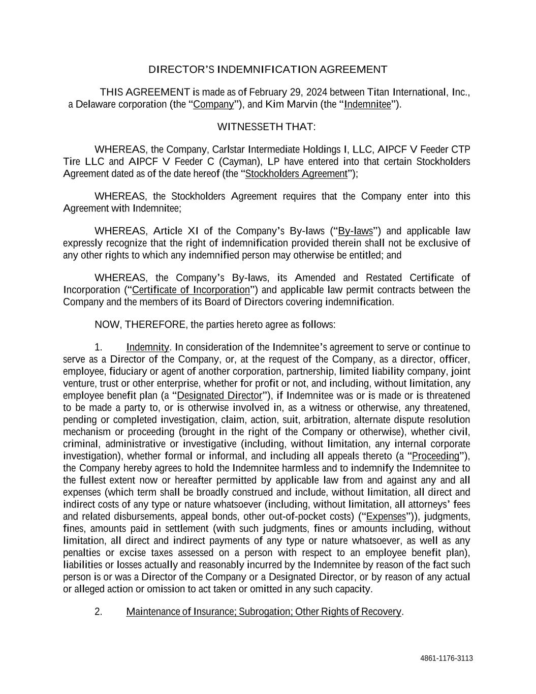4861-1176-3113 DIRECTOR’S INDEMNIFICATION AGREEMENT THIS AGREEMENT is made as of February 29, 2024 between Titan International, Inc., a Delaware corporation (the “Company”), and Kim Marvin (the “Indemnitee”). WITNESSETH THAT: WHEREAS, the Company, Carlstar Intermediate Holdings I, LLC, AIPCF V Feeder CTP Tire LLC and AIPCF V Feeder C (Cayman), LP have entered into that certain Stockholders Agreement dated as of the date hereof (the “Stockholders Agreement”); WHEREAS, the Stockholders Agreement requires that the Company enter into this Agreement with Indemnitee; WHEREAS, Article XI of the Company’s By-laws (“By-laws”) and applicable law expressly recognize that the right of indemnification provided therein shall not be exclusive of any other rights to which any indemnified person may otherwise be entitled; and WHEREAS, the Company’s By-laws, its Amended and Restated Certificate of Incorporation (“Certificate of Incorporation”) and applicable law permit contracts between the Company and the members of its Board of Directors covering indemnification. NOW, THEREFORE, the parties hereto agree as follows: 1. Indemnity. In consideration of the Indemnitee’s agreement to serve or continue to serve as a Director of the Company, or, at the request of the Company, as a director, officer, employee, fiduciary or agent of another corporation, partnership, limited liability company, joint venture, trust or other enterprise, whether for profit or not, and including, without limitation, any employee benefit plan (a “Designated Director”), if Indemnitee was or is made or is threatened to be made a party to, or is otherwise involved in, as a witness or otherwise, any threatened, pending or completed investigation, claim, action, suit, arbitration, alternate dispute resolution mechanism or proceeding (brought in the right of the Company or otherwise), whether civil, criminal, administrative or investigative (including, without limitation, any internal corporate investigation), whether formal or informal, and including all appeals thereto (a “Proceeding”), the Company hereby agrees to hold the Indemnitee harmless and to indemnify the Indemnitee to the fullest extent now or hereafter permitted by applicable law from and against any and all expenses (which term shall be broadly construed and include, without limitation, all direct and indirect costs of any type or nature whatsoever (including, without limitation, all attorneys’ fees and related disbursements, appeal bonds, other out-of-pocket costs) (“Expenses”)), judgments, fines, amounts paid in settlement (with such judgments, fines or amounts including, without limitation, all direct and indirect payments of any type or nature whatsoever, as well as any penalties or excise taxes assessed on a person with respect to an employee benefit plan), liabilities or losses actually and reasonably incurred by the Indemnitee by reason of the fact such person is or was a Director of the Company or a Designated Director, or by reason of any actual or alleged action or omission to act taken or omitted in any such capacity. 2. Maintenance of Insurance; Subrogation; Other Rights of Recovery.