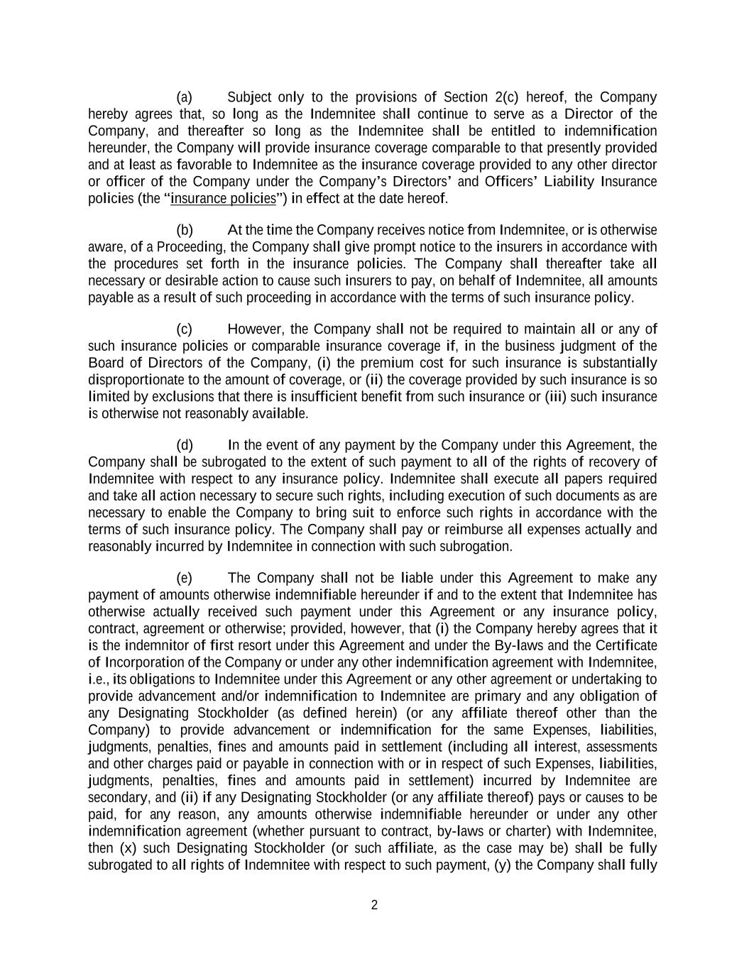 2 (a) Subject only to the provisions of Section 2(c) hereof, the Company hereby agrees that, so long as the Indemnitee shall continue to serve as a Director of the Company, and thereafter so long as the Indemnitee shall be entitled to indemnification hereunder, the Company will provide insurance coverage comparable to that presently provided and at least as favorable to Indemnitee as the insurance coverage provided to any other director or officer of the Company under the Company’s Directors’ and Officers’ Liability Insurance policies (the “insurance policies”) in effect at the date hereof. (b) At the time the Company receives notice from Indemnitee, or is otherwise aware, of a Proceeding, the Company shall give prompt notice to the insurers in accordance with the procedures set forth in the insurance policies. The Company shall thereafter take all necessary or desirable action to cause such insurers to pay, on behalf of Indemnitee, all amounts payable as a result of such proceeding in accordance with the terms of such insurance policy. (c) However, the Company shall not be required to maintain all or any of such insurance policies or comparable insurance coverage if, in the business judgment of the Board of Directors of the Company, (i) the premium cost for such insurance is substantially disproportionate to the amount of coverage, or (ii) the coverage provided by such insurance is so limited by exclusions that there is insufficient benefit from such insurance or (iii) such insurance is otherwise not reasonably available. (d) In the event of any payment by the Company under this Agreement, the Company shall be subrogated to the extent of such payment to all of the rights of recovery of Indemnitee with respect to any insurance policy. Indemnitee shall execute all papers required and take all action necessary to secure such rights, including execution of such documents as are necessary to enable the Company to bring suit to enforce such rights in accordance with the terms of such insurance policy. The Company shall pay or reimburse all expenses actually and reasonably incurred by Indemnitee in connection with such subrogation. (e) The Company shall not be liable under this Agreement to make any payment of amounts otherwise indemnifiable hereunder if and to the extent that Indemnitee has otherwise actually received such payment under this Agreement or any insurance policy, contract, agreement or otherwise; provided, however, that (i) the Company hereby agrees that it is the indemnitor of first resort under this Agreement and under the By-laws and the Certificate of Incorporation of the Company or under any other indemnification agreement with Indemnitee, i.e., its obligations to Indemnitee under this Agreement or any other agreement or undertaking to provide advancement and/or indemnification to Indemnitee are primary and any obligation of any Designating Stockholder (as defined herein) (or any affiliate thereof other than the Company) to provide advancement or indemnification for the same Expenses, liabilities, judgments, penalties, fines and amounts paid in settlement (including all interest, assessments and other charges paid or payable in connection with or in respect of such Expenses, liabilities, judgments, penalties, fines and amounts paid in settlement) incurred by Indemnitee are secondary, and (ii) if any Designating Stockholder (or any affiliate thereof) pays or causes to be paid, for any reason, any amounts otherwise indemnifiable hereunder or under any other indemnification agreement (whether pursuant to contract, by-laws or charter) with Indemnitee, then (x) such Designating Stockholder (or such affiliate, as the case may be) shall be fully subrogated to all rights of Indemnitee with respect to such payment, (y) the Company shall fully