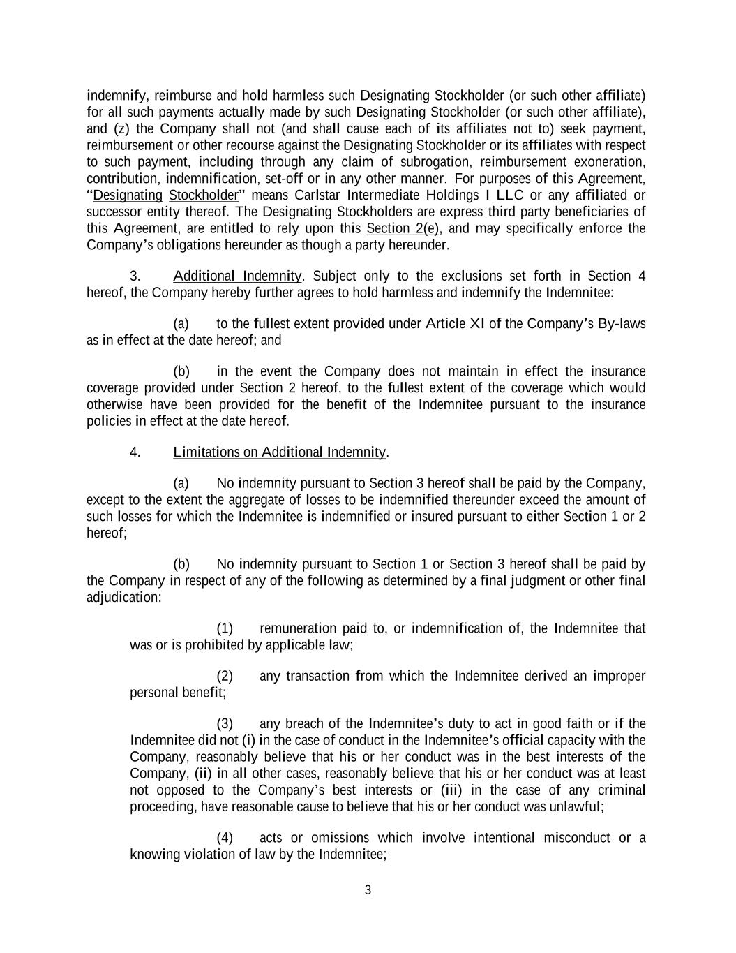 3 indemnify, reimburse and hold harmless such Designating Stockholder (or such other affiliate) for all such payments actually made by such Designating Stockholder (or such other affiliate), and (z) the Company shall not (and shall cause each of its affiliates not to) seek payment, reimbursement or other recourse against the Designating Stockholder or its affiliates with respect to such payment, including through any claim of subrogation, reimbursement exoneration, contribution, indemnification, set-off or in any other manner. For purposes of this Agreement, “Designating Stockholder” means Carlstar Intermediate Holdings I LLC or any affiliated or successor entity thereof. The Designating Stockholders are express third party beneficiaries of this Agreement, are entitled to rely upon this Section 2(e), and may specifically enforce the Company’s obligations hereunder as though a party hereunder. 3. Additional Indemnity. Subject only to the exclusions set forth in Section 4 hereof, the Company hereby further agrees to hold harmless and indemnify the Indemnitee: (a) to the fullest extent provided under Article XI of the Company’s By-laws as in effect at the date hereof; and (b) in the event the Company does not maintain in effect the insurance coverage provided under Section 2 hereof, to the fullest extent of the coverage which would otherwise have been provided for the benefit of the Indemnitee pursuant to the insurance policies in effect at the date hereof. 4. Limitations on Additional Indemnity. (a) No indemnity pursuant to Section 3 hereof shall be paid by the Company, except to the extent the aggregate of losses to be indemnified thereunder exceed the amount of such losses for which the Indemnitee is indemnified or insured pursuant to either Section 1 or 2 hereof; (b) No indemnity pursuant to Section 1 or Section 3 hereof shall be paid by the Company in respect of any of the following as determined by a final judgment or other final adjudication: (1) remuneration paid to, or indemnification of, the Indemnitee that was or is prohibited by applicable law; (2) any transaction from which the Indemnitee derived an improper personal benefit; (3) any breach of the Indemnitee’s duty to act in good faith or if the Indemnitee did not (i) in the case of conduct in the Indemnitee’s official capacity with the Company, reasonably believe that his or her conduct was in the best interests of the Company, (ii) in all other cases, reasonably believe that his or her conduct was at least not opposed to the Company’s best interests or (iii) in the case of any criminal proceeding, have reasonable cause to believe that his or her conduct was unlawful; (4) acts or omissions which involve intentional misconduct or a knowing violation of law by the Indemnitee;