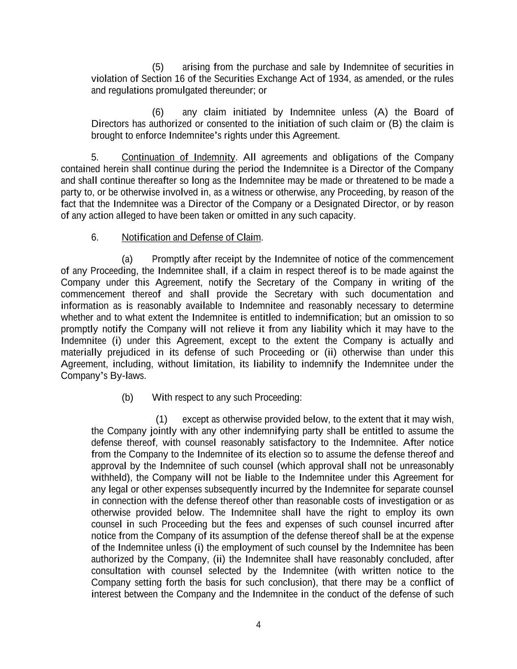 4 (5) arising from the purchase and sale by Indemnitee of securities in violation of Section 16 of the Securities Exchange Act of 1934, as amended, or the rules and regulations promulgated thereunder; or (6) any claim initiated by Indemnitee unless (A) the Board of Directors has authorized or consented to the initiation of such claim or (B) the claim is brought to enforce Indemnitee’s rights under this Agreement. 5. Continuation of Indemnity. All agreements and obligations of the Company contained herein shall continue during the period the Indemnitee is a Director of the Company and shall continue thereafter so long as the Indemnitee may be made or threatened to be made a party to, or be otherwise involved in, as a witness or otherwise, any Proceeding, by reason of the fact that the Indemnitee was a Director of the Company or a Designated Director, or by reason of any action alleged to have been taken or omitted in any such capacity. 6. Notification and Defense of Claim. (a) Promptly after receipt by the Indemnitee of notice of the commencement of any Proceeding, the Indemnitee shall, if a claim in respect thereof is to be made against the Company under this Agreement, notify the Secretary of the Company in writing of the commencement thereof and shall provide the Secretary with such documentation and information as is reasonably available to Indemnitee and reasonably necessary to determine whether and to what extent the Indemnitee is entitled to indemnification; but an omission to so promptly notify the Company will not relieve it from any liability which it may have to the Indemnitee (i) under this Agreement, except to the extent the Company is actually and materially prejudiced in its defense of such Proceeding or (ii) otherwise than under this Agreement, including, without limitation, its liability to indemnify the Indemnitee under the Company’s By-laws. (b) With respect to any such Proceeding: (1) except as otherwise provided below, to the extent that it may wish, the Company jointly with any other indemnifying party shall be entitled to assume the defense thereof, with counsel reasonably satisfactory to the Indemnitee. After notice from the Company to the Indemnitee of its election so to assume the defense thereof and approval by the Indemnitee of such counsel (which approval shall not be unreasonably withheld), the Company will not be liable to the Indemnitee under this Agreement for any legal or other expenses subsequently incurred by the Indemnitee for separate counsel in connection with the defense thereof other than reasonable costs of investigation or as otherwise provided below. The Indemnitee shall have the right to employ its own counsel in such Proceeding but the fees and expenses of such counsel incurred after notice from the Company of its assumption of the defense thereof shall be at the expense of the Indemnitee unless (i) the employment of such counsel by the Indemnitee has been authorized by the Company, (ii) the Indemnitee shall have reasonably concluded, after consultation with counsel selected by the Indemnitee (with written notice to the Company setting forth the basis for such conclusion), that there may be a conflict of interest between the Company and the Indemnitee in the conduct of the defense of such