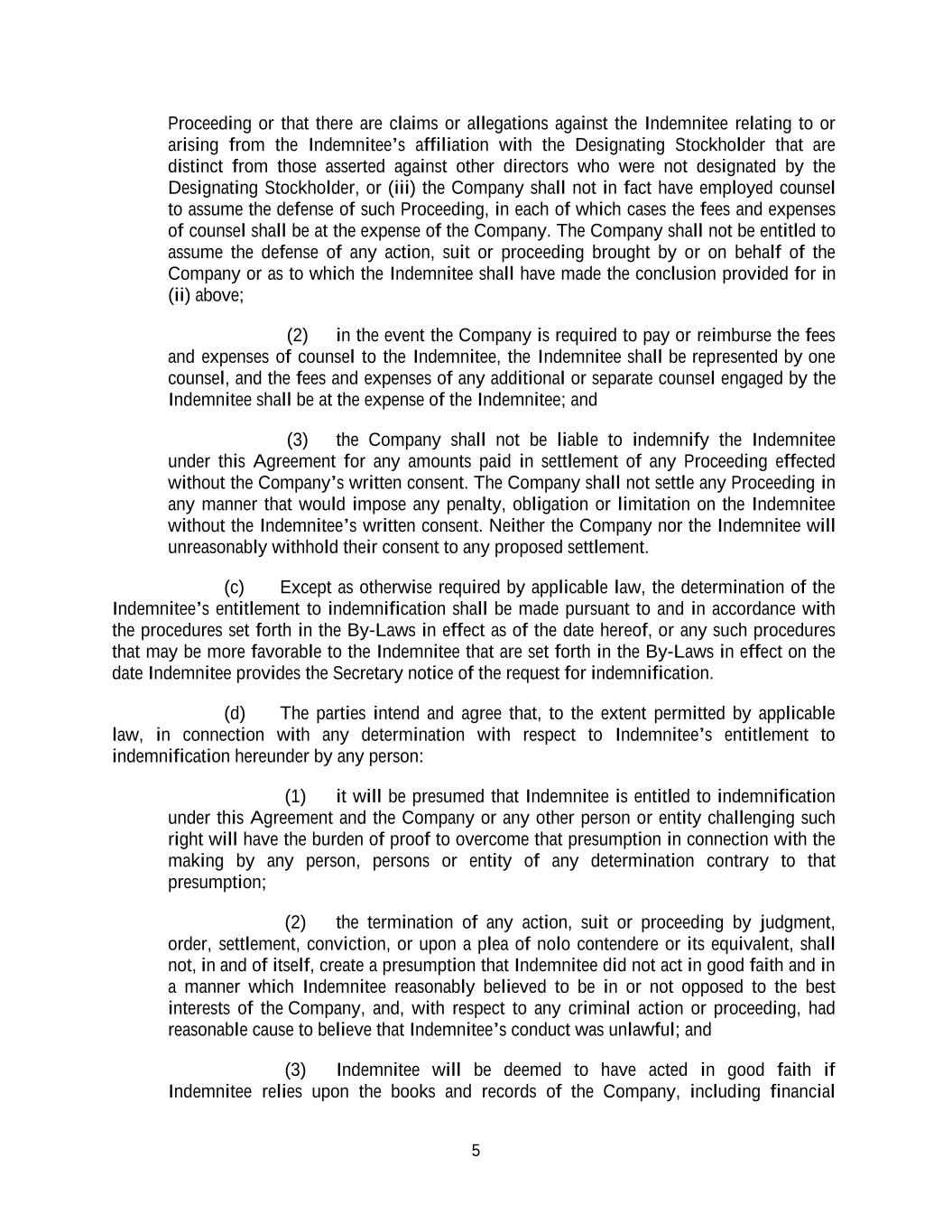 5 Proceeding or that there are claims or allegations against the Indemnitee relating to or arising from the Indemnitee’s affiliation with the Designating Stockholder that are distinct from those asserted against other directors who were not designated by the Designating Stockholder, or (iii) the Company shall not in fact have employed counsel to assume the defense of such Proceeding, in each of which cases the fees and expenses of counsel shall be at the expense of the Company. The Company shall not be entitled to assume the defense of any action, suit or proceeding brought by or on behalf of the Company or as to which the Indemnitee shall have made the conclusion provided for in (ii) above; (2) in the event the Company is required to pay or reimburse the fees and expenses of counsel to the Indemnitee, the Indemnitee shall be represented by one counsel, and the fees and expenses of any additional or separate counsel engaged by the Indemnitee shall be at the expense of the Indemnitee; and (3) the Company shall not be liable to indemnify the Indemnitee under this Agreement for any amounts paid in settlement of any Proceeding effected without the Company’s written consent. The Company shall not settle any Proceeding in any manner that would impose any penalty, obligation or limitation on the Indemnitee without the Indemnitee’s written consent. Neither the Company nor the Indemnitee will unreasonably withhold their consent to any proposed settlement. (c) Except as otherwise required by applicable law, the determination of the Indemnitee’s entitlement to indemnification shall be made pursuant to and in accordance with the procedures set forth in the By-Laws in effect as of the date hereof, or any such procedures that may be more favorable to the Indemnitee that are set forth in the By-Laws in effect on the date Indemnitee provides the Secretary notice of the request for indemnification. (d) The parties intend and agree that, to the extent permitted by applicable law, in connection with any determination with respect to Indemnitee’s entitlement to indemnification hereunder by any person: (1) it will be presumed that Indemnitee is entitled to indemnification under this Agreement and the Company or any other person or entity challenging such right will have the burden of proof to overcome that presumption in connection with the making by any person, persons or entity of any determination contrary to that presumption; (2) the termination of any action, suit or proceeding by judgment, order, settlement, conviction, or upon a plea of nolo contendere or its equivalent, shall not, in and of itself, create a presumption that Indemnitee did not act in good faith and in a manner which Indemnitee reasonably believed to be in or not opposed to the best interests of the Company, and, with respect to any criminal action or proceeding, had reasonable cause to believe that Indemnitee’s conduct was unlawful; and (3) Indemnitee will be deemed to have acted in good faith if Indemnitee relies upon the books and records of the Company, including financial
