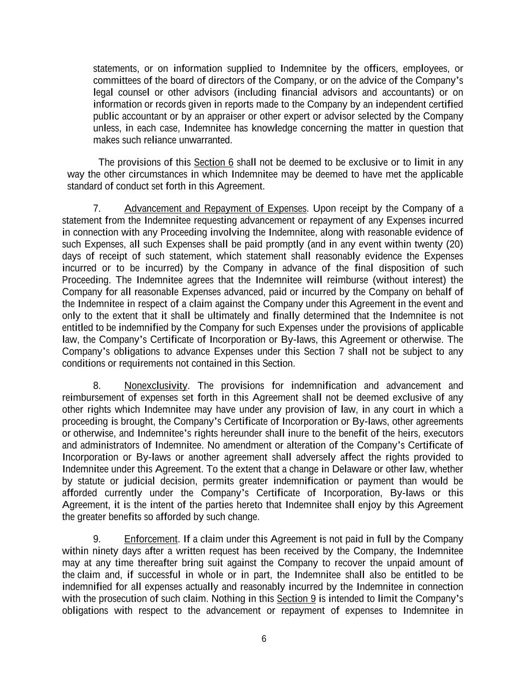 6 statements, or on information supplied to Indemnitee by the officers, employees, or committees of the board of directors of the Company, or on the advice of the Company’s legal counsel or other advisors (including financial advisors and accountants) or on information or records given in reports made to the Company by an independent certified public accountant or by an appraiser or other expert or advisor selected by the Company unless, in each case, Indemnitee has knowledge concerning the matter in question that makes such reliance unwarranted. The provisions of this Section 6 shall not be deemed to be exclusive or to limit in any way the other circumstances in which Indemnitee may be deemed to have met the applicable standard of conduct set forth in this Agreement. 7. Advancement and Repayment of Expenses. Upon receipt by the Company of a statement from the Indemnitee requesting advancement or repayment of any Expenses incurred in connection with any Proceeding involving the Indemnitee, along with reasonable evidence of such Expenses, all such Expenses shall be paid promptly (and in any event within twenty (20) days of receipt of such statement, which statement shall reasonably evidence the Expenses incurred or to be incurred) by the Company in advance of the final disposition of such Proceeding. The Indemnitee agrees that the Indemnitee will reimburse (without interest) the Company for all reasonable Expenses advanced, paid or incurred by the Company on behalf of the Indemnitee in respect of a claim against the Company under this Agreement in the event and only to the extent that it shall be ultimately and finally determined that the Indemnitee is not entitled to be indemnified by the Company for such Expenses under the provisions of applicable law, the Company’s Certificate of Incorporation or By-laws, this Agreement or otherwise. The Company’s obligations to advance Expenses under this Section 7 shall not be subject to any conditions or requirements not contained in this Section. 8. Nonexclusivity. The provisions for indemnification and advancement and reimbursement of expenses set forth in this Agreement shall not be deemed exclusive of any other rights which Indemnitee may have under any provision of law, in any court in which a proceeding is brought, the Company’s Certificate of Incorporation or By-laws, other agreements or otherwise, and Indemnitee’s rights hereunder shall inure to the benefit of the heirs, executors and administrators of Indemnitee. No amendment or alteration of the Company’s Certificate of Incorporation or By-laws or another agreement shall adversely affect the rights provided to Indemnitee under this Agreement. To the extent that a change in Delaware or other law, whether by statute or judicial decision, permits greater indemnification or payment than would be afforded currently under the Company’s Certificate of Incorporation, By-laws or this Agreement, it is the intent of the parties hereto that Indemnitee shall enjoy by this Agreement the greater benefits so afforded by such change. 9. Enforcement. If a claim under this Agreement is not paid in full by the Company within ninety days after a written request has been received by the Company, the Indemnitee may at any time thereafter bring suit against the Company to recover the unpaid amount of the claim and, if successful in whole or in part, the Indemnitee shall also be entitled to be indemnified for all expenses actually and reasonably incurred by the Indemnitee in connection with the prosecution of such claim. Nothing in this Section 9 is intended to limit the Company’s obligations with respect to the advancement or repayment of expenses to Indemnitee in