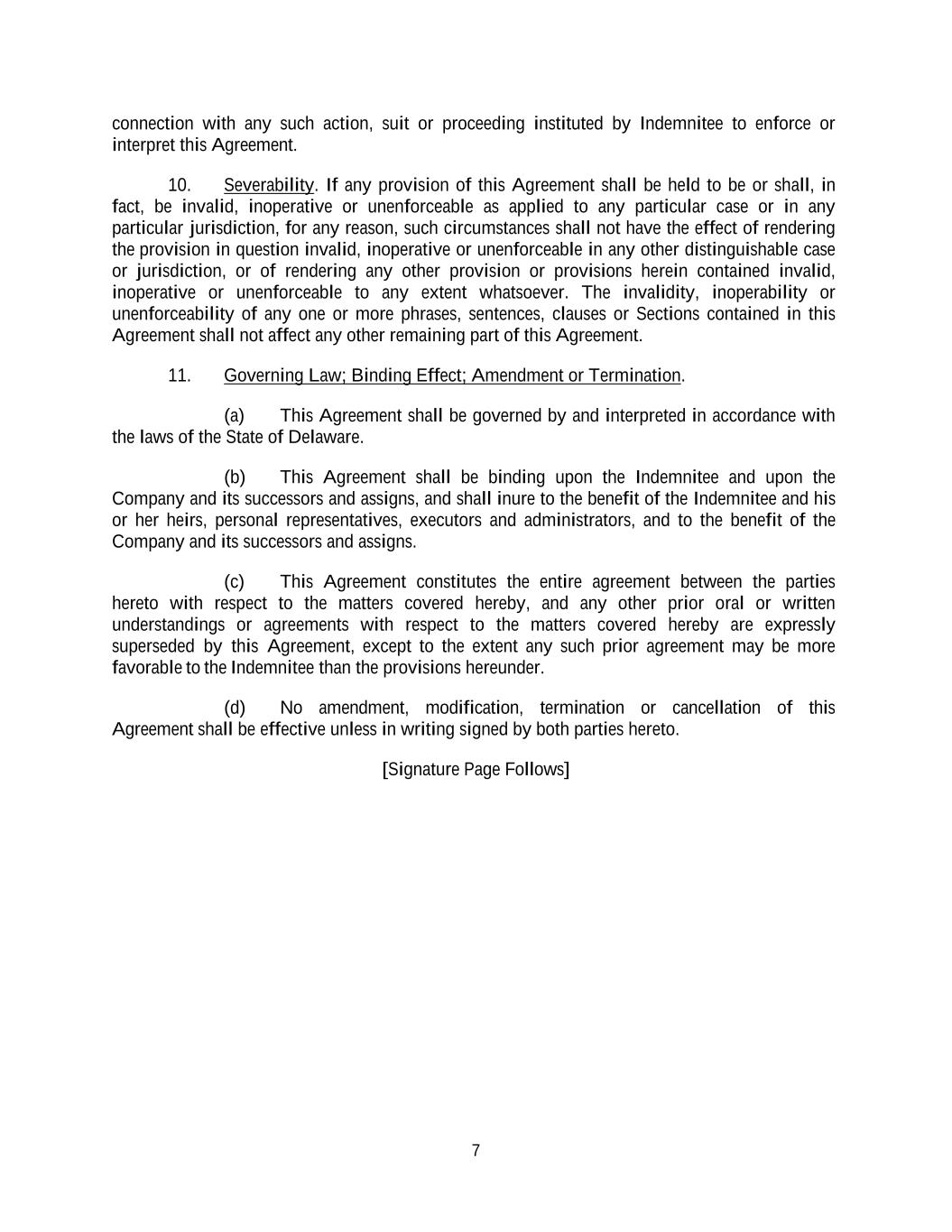 7 connection with any such action, suit or proceeding instituted by Indemnitee to enforce or interpret this Agreement. 10. Severability. If any provision of this Agreement shall be held to be or shall, in fact, be invalid, inoperative or unenforceable as applied to any particular case or in any particular jurisdiction, for any reason, such circumstances shall not have the effect of rendering the provision in question invalid, inoperative or unenforceable in any other distinguishable case or jurisdiction, or of rendering any other provision or provisions herein contained invalid, inoperative or unenforceable to any extent whatsoever. The invalidity, inoperability or unenforceability of any one or more phrases, sentences, clauses or Sections contained in this Agreement shall not affect any other remaining part of this Agreement. 11. Governing Law; Binding Effect; Amendment or Termination. (a) This Agreement shall be governed by and interpreted in accordance with the laws of the State of Delaware. (b) This Agreement shall be binding upon the Indemnitee and upon the Company and its successors and assigns, and shall inure to the benefit of the Indemnitee and his or her heirs, personal representatives, executors and administrators, and to the benefit of the Company and its successors and assigns. (c) This Agreement constitutes the entire agreement between the parties hereto with respect to the matters covered hereby, and any other prior oral or written understandings or agreements with respect to the matters covered hereby are expressly superseded by this Agreement, except to the extent any such prior agreement may be more favorable to the Indemnitee than the provisions hereunder. (d) No amendment, modification, termination or cancellation of this Agreement shall be effective unless in writing signed by both parties hereto. [Signature Page Follows]