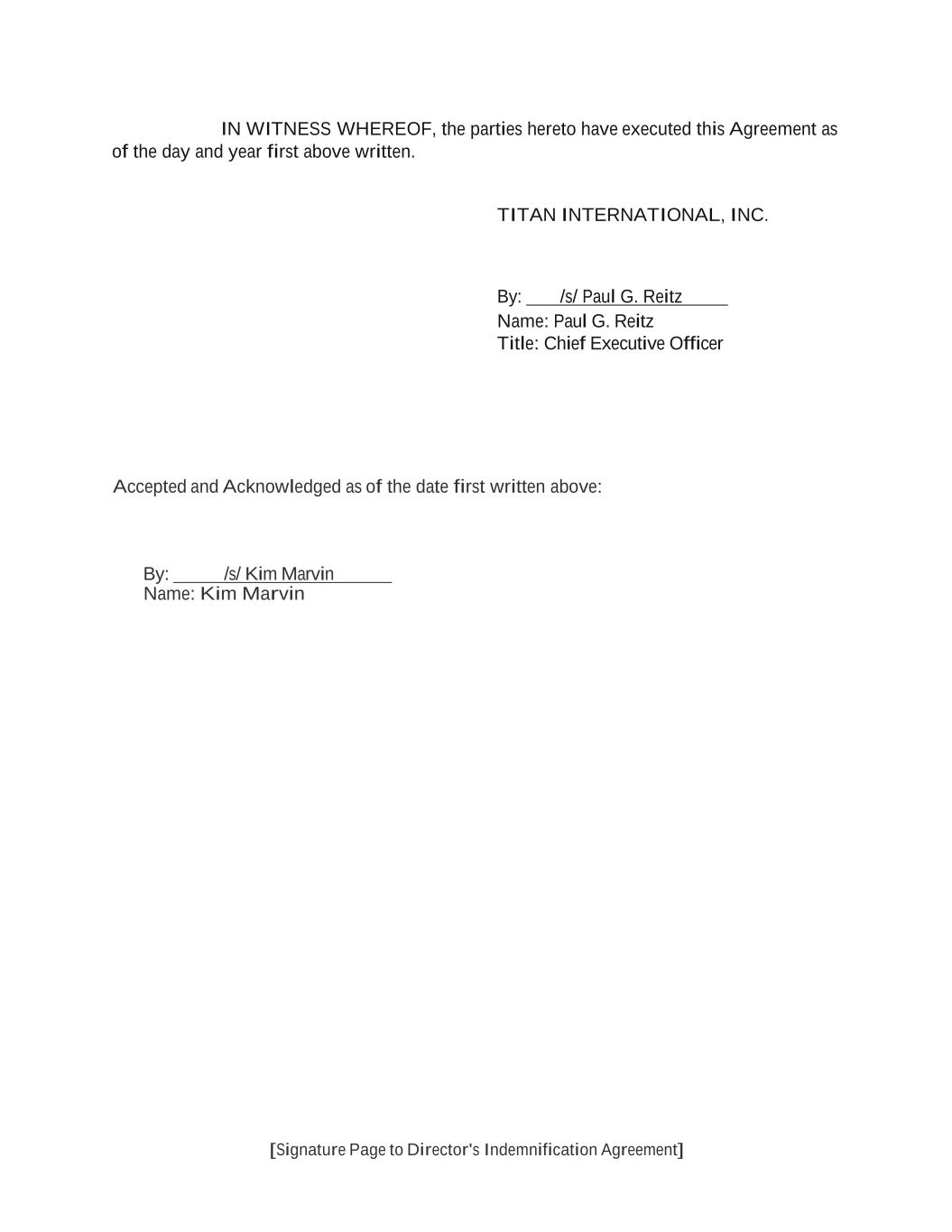 [Signature Page to Director's Indemnification Agreement] IN WITNESS WHEREOF, the parties hereto have executed this Agreement as of the day and year first above written. TITAN INTERNATIONAL, INC. By: /s/ Paul G. Reitz Name: Paul G. Reitz Title: Chief Executive Officer Accepted and Acknowledged as of the date first written above: By: /s/ Kim Marvin Name: Kim Marvin