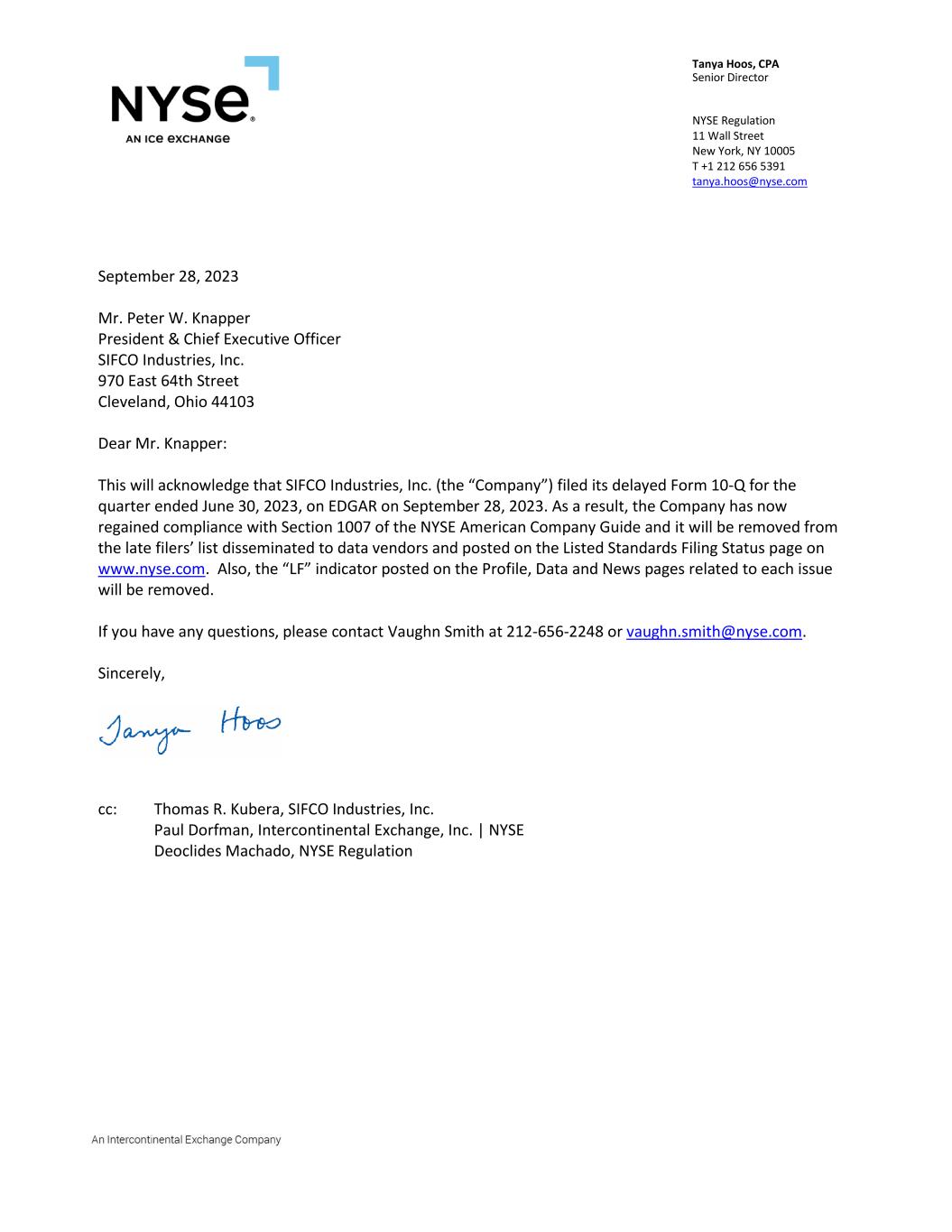 September 28, 2023 Mr. Peter W. Knapper President & Chief Executive Officer SIFCO Industries, Inc. 970 East 64th Street Cleveland, Ohio 44103 Dear Mr. Knapper: This will acknowledge that SIFCO Industries, Inc. (the “Company”) filed its delayed Form 10-Q for the quarter ended June 30, 2023, on EDGAR on September 28, 2023. As a result, the Company has now regained compliance with Section 1007 of the NYSE American Company Guide and it will be removed from the late filers’ list disseminated to data vendors and posted on the Listed Standards Filing Status page on www.nyse.com. Also, the “LF” indicator posted on the Profile, Data and News pages related to each issue will be removed. If you have any questions, please contact Vaughn Smith at 212-656-2248 or vaughn.smith@nyse.com. Sincerely, cc: Thomas R. Kubera, SIFCO Industries, Inc. Paul Dorfman, Intercontinental Exchange, Inc. | NYSE Deoclides Machado, NYSE Regulation Tanya Hoos, CPA Senior Director NYSE Regulation 11 Wall Street New York, NY 10005 T +1 212 656 5391 tanya.hoos@nyse.com