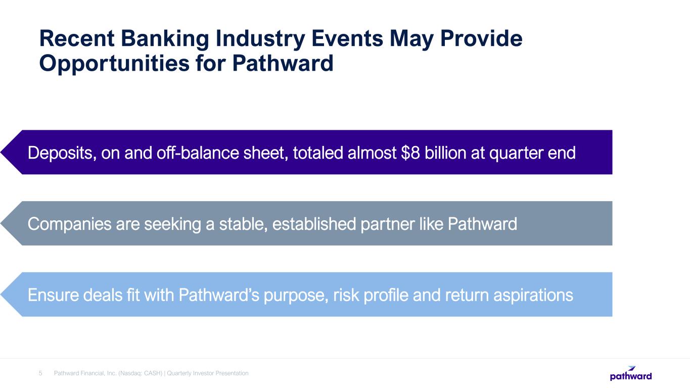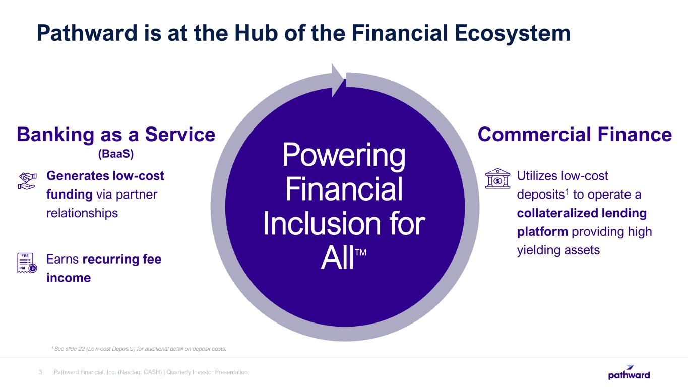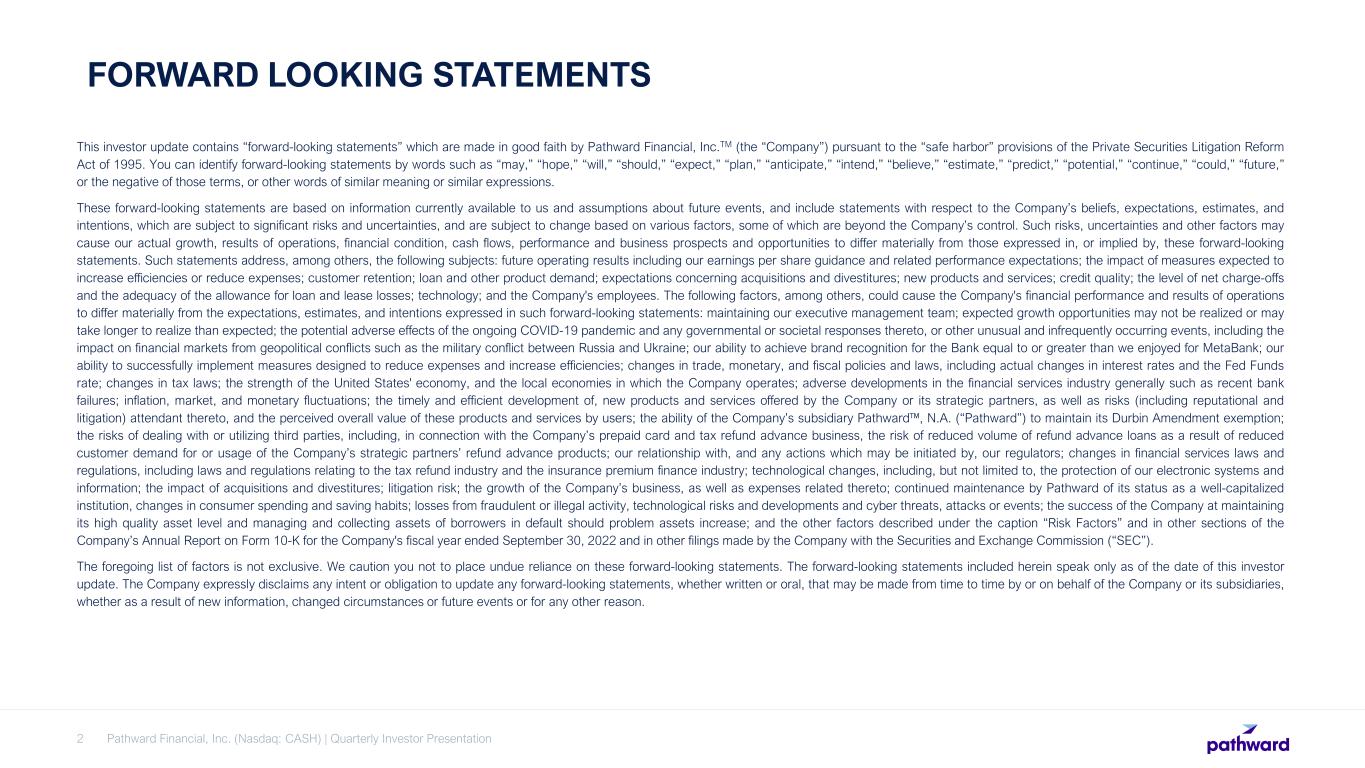 Pathward Financial, Inc. (Nasdaq: CASH) | Quarterly Investor Presentation2 FORWARD LOOKING STATEMENTS This investor update contains “forward-looking statements” which are made in good faith by Pathward Financial, Inc.TM (the “Company”) pursuant to the “safe harbor” provisions of the Private Securities Litigation Reform Act of 1995. You can identify forward-looking statements by words such as “may,” “hope,” “will,” “should,” “expect,” “plan,” “anticipate,” “intend,” “believe,” “estimate,” “predict,” “potential,” “continue,” “could,” “future,” or the negative of those terms, or other words of similar meaning or similar expressions. These forward-looking statements are based on information currently available to us and assumptions about future events, and include statements with respect to the Company’s beliefs, expectations, estimates, and intentions, which are subject to significant risks and uncertainties, and are subject to change based on various factors, some of which are beyond the Company’s control. Such risks, uncertainties and other factors may cause our actual growth, results of operations, financial condition, cash flows, performance and business prospects and opportunities to differ materially from those expressed in, or implied by, these forward-looking statements. Such statements address, among others, the following subjects: future operating results including our earnings per share guidance and related performance expectations; the impact of measures expected to increase efficiencies or reduce expenses; customer retention; loan and other product demand; expectations concerning acquisitions and divestitures; new products and services; credit quality; the level of net charge-offs and the adequacy of the allowance for loan and lease losses; technology; and the Company's employees. The following factors, among others, could cause the Company's financial performance and results of operations to differ materially from the expectations, estimates, and intentions expressed in such forward-looking statements: maintaining our executive management team; expected growth opportunities may not be realized or may take longer to realize than expected; the potential adverse effects of the ongoing COVID-19 pandemic and any governmental or societal responses thereto, or other unusual and infrequently occurring events, including the impact on financial markets from geopolitical conflicts such as the military conflict between Russia and Ukraine; our ability to achieve brand recognition for the Bank equal to or greater than we enjoyed for MetaBank; our ability to successfully implement measures designed to reduce expenses and increase efficiencies; changes in trade, monetary, and fiscal policies and laws, including actual changes in interest rates and the Fed Funds rate; changes in tax laws; the strength of the United States' economy, and the local economies in which the Company operates; adverse developments in the financial services industry generally such as recent bank failures; inflation, market, and monetary fluctuations; the timely and efficient development of, new products and services offered by the Company or its strategic partners, as well as risks (including reputational and litigation) attendant thereto, and the perceived overall value of these products and services by users; the ability of the Company’s subsidiary Pathward™, N.A. (“Pathward”) to maintain its Durbin Amendment exemption; the risks of dealing with or utilizing third parties, including, in connection with the Company’s prepaid card and tax refund advance business, the risk of reduced volume of refund advance loans as a result of reduced customer demand for or usage of the Company’s strategic partners’ refund advance products; our relationship with, and any actions which may be initiated by, our regulators; changes in financial services laws and regulations, including laws and regulations relating to the tax refund industry and the insurance premium finance industry; technological changes, including, but not limited to, the protection of our electronic systems and information; the impact of acquisitions and divestitures; litigation risk; the growth of the Company’s business, as well as expenses related thereto; continued maintenance by Pathward of its status as a well-capitalized institution, changes in consumer spending and saving habits; losses from fraudulent or illegal activity, technological risks and developments and cyber threats, attacks or events; the success of the Company at maintaining its high quality asset level and managing and collecting assets of borrowers in default should problem assets increase; and the other factors described under the caption “Risk Factors” and in other sections of the Company’s Annual Report on Form 10-K for the Company's fiscal year ended September 30, 2022 and in other filings made by the Company with the Securities and Exchange Commission (“SEC”). The foregoing list of factors is not exclusive. We caution you not to place undue reliance on these forward-looking statements. The forward-looking statements included herein speak only as of the date of this investor update. The Company expressly disclaims any intent or obligation to update any forward-looking statements, whether written or oral, that may be made from time to time by or on behalf of the Company or its subsidiaries, whether as a result of new information, changed circumstances or future events or for any other reason.