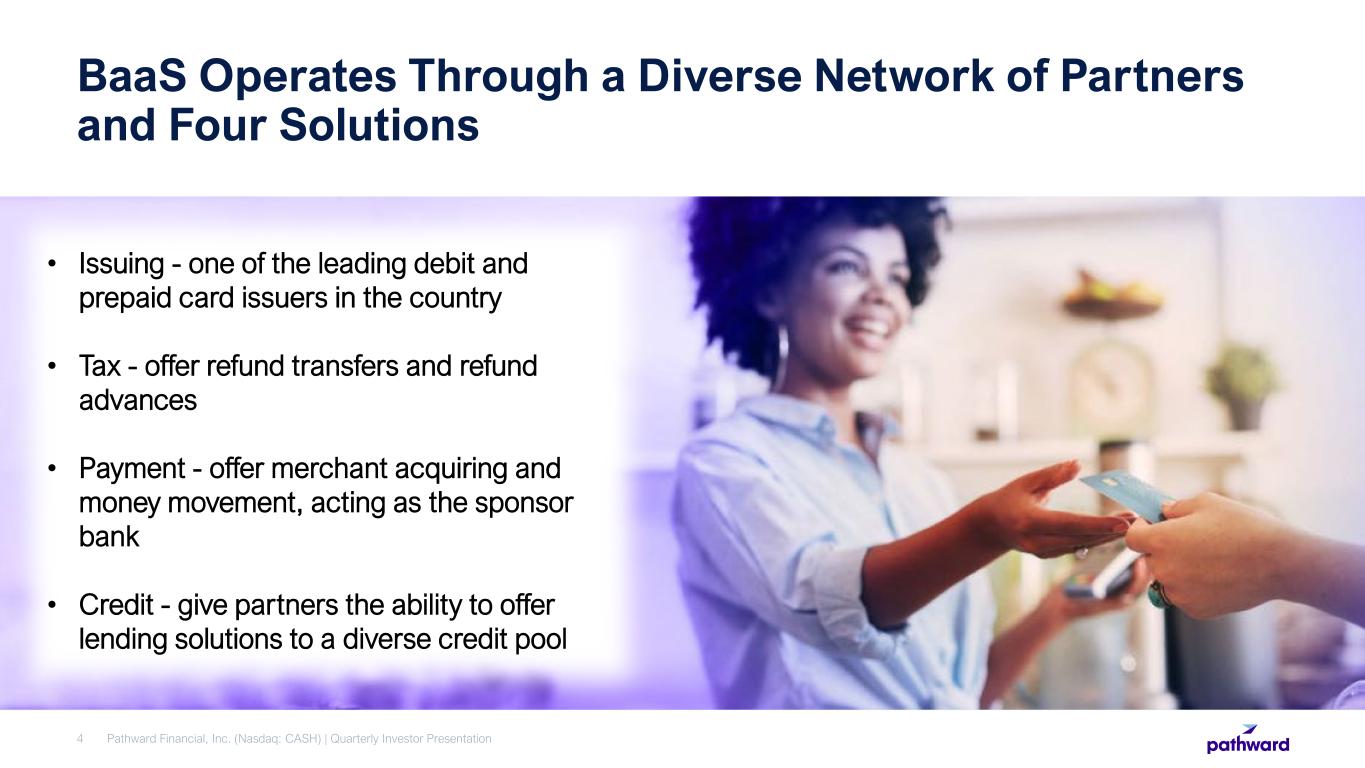 Powering Financial Inclusion for AllTM 3 Pathward is at the Hub of the Financial Ecosystem Generates low-cost funding via partner relationships Earns recurring fee income Utilizes low-cost deposits1 to operate a collateralized lending platform providing high yielding assets Banking as a Service (BaaS) Commercial Finance Pathward Financial, Inc. (Nasdaq: CASH) | Quarterly Investor Presentation 1 See slide 22 (Low-cost Deposits) for additional detail on deposit costs.