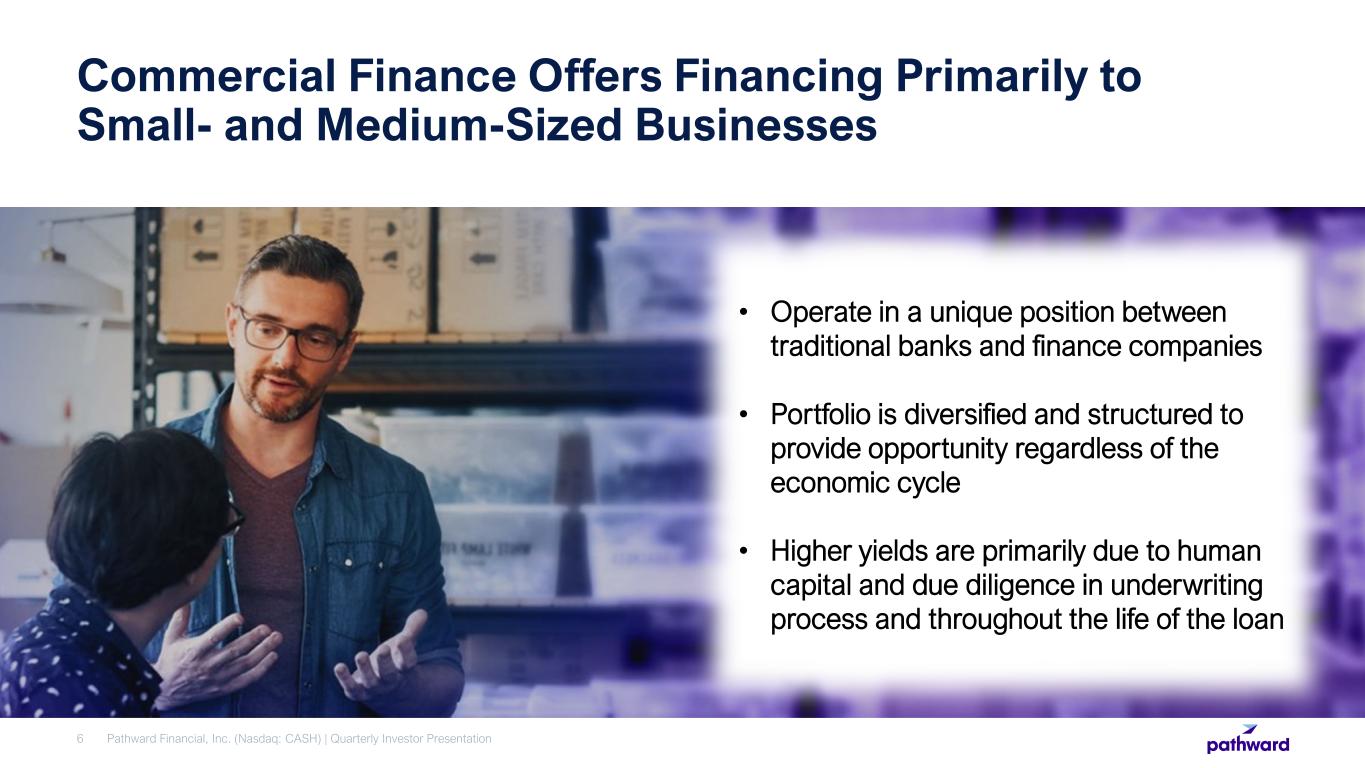 2 3 4 1 Record of strong earnings growth and profitability above banking industry averages Resilient Commercial Finance loan portfolio produces attractive returns throughout economic cycles Experienced leader in fast-growing Banking as a Service (BaaS) sector, with diversified portfolio of high-quality financial partners Highly advantageous national bank charter, with well-developed risk mitigation and compliance capabilities Excess capital generating business enables ongoing return of value to shareholders 5 Investment Highlights