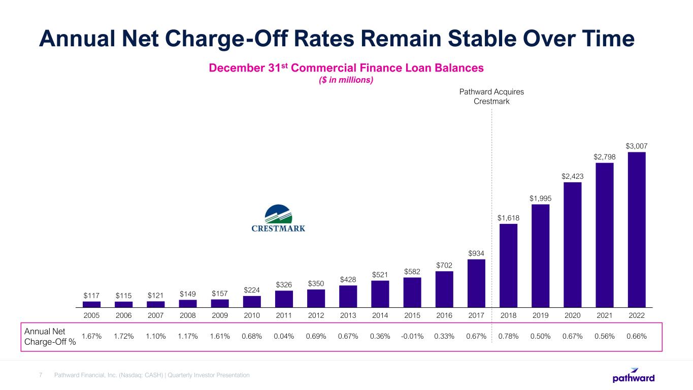 Commercial Finance Offers Financing Primarily to Small- and Medium-Sized Businesses Pathward Financial, Inc. (Nasdaq: CASH) | Quarterly Investor Presentation6 • Operate in a unique position between traditional banks and finance companies • Portfolio is diversified and structured to provide opportunity regardless of the economic cycle • Higher yields are primarily due to human capital and due diligence in underwriting process and throughout the life of the loan