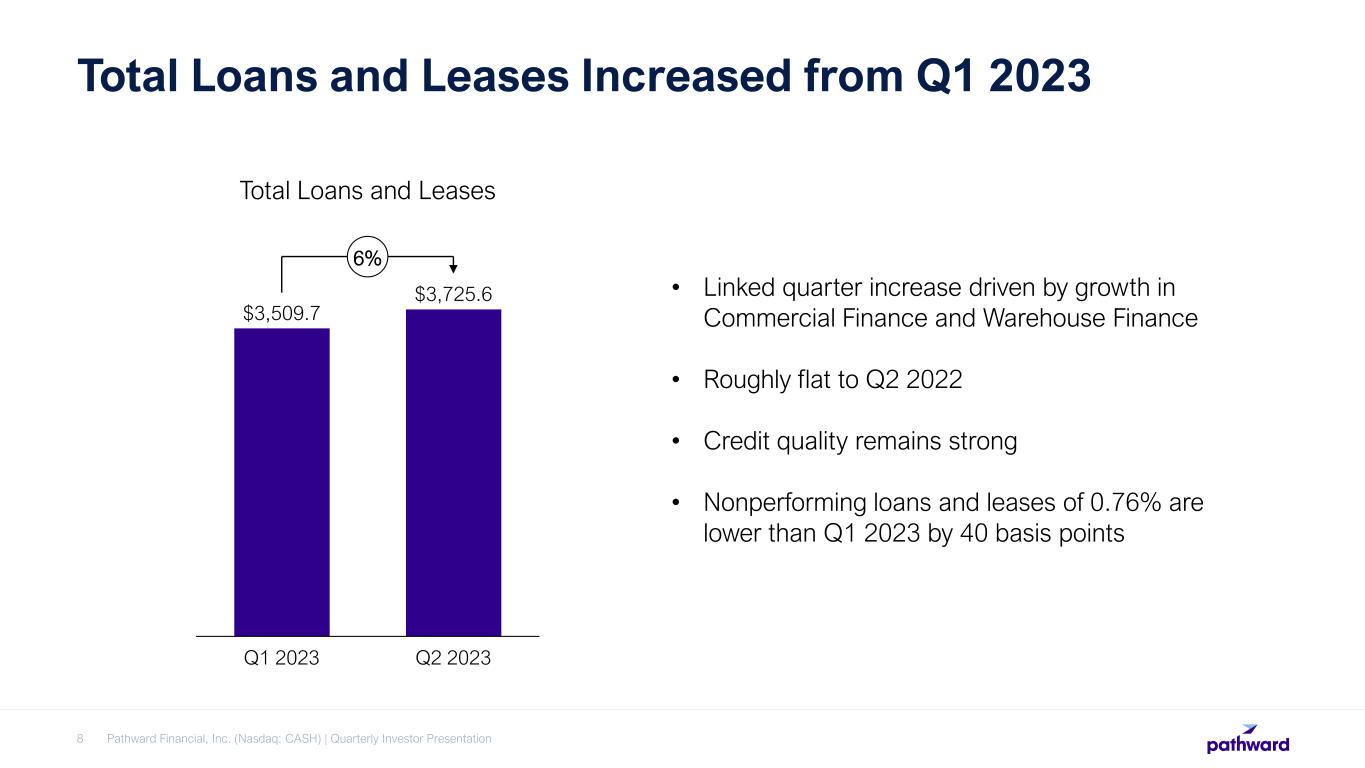 Annual Net Charge-Off Rates Remain Stable Over Time Pathward Financial, Inc. (Nasdaq: CASH) | Quarterly Investor Presentation7 Pathward Acquires Crestmark December 31st Commercial Finance Loan Balances ($ in millions) $117 $115 $121 $149 $157 $224 $326 $350 $428 $521 $582 $702 $934 $1,618 $1,995 $2,423 $2,798 $3,007 0.0 0.1 0.2 0.3 0.4 0.5 0.6 0.7 0.8 0.9 1.0 0 500 1,000 1,500 2,000 2,500 3,000 3,500 2005 1.67% 2006 1.72% 2007 1.10% 2008 1.17% 2009 1.61% 2010 0.68% 2011 0.04% 2012 0.69% 2013 0.67% 2014 0.36% 2015 -0.01% 2016 0.33% 2017 0.67% 2018 0.78% 2019 0.50% 2020 0.67% 2021 0.56% 2022 0.66% Annual Net Charge-Off %