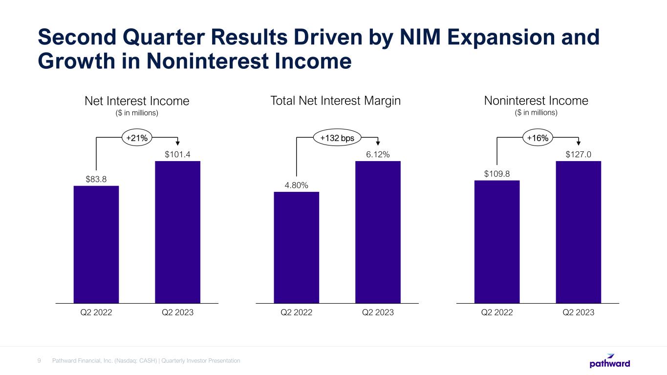 Total Loans and Leases Increased from Q1 2023 Pathward Financial, Inc. (Nasdaq: CASH) | Quarterly Investor Presentation8 $3,509.7 $3,725.6 Q1 2023 Q2 2023 6% Total Loans and Leases • Linked quarter increase driven by growth in Commercial Finance and Warehouse Finance • Roughly flat to Q2 2022 • Credit quality remains strong • Nonperforming loans and leases of 0.76% are lower than Q1 2023 by 40 basis points