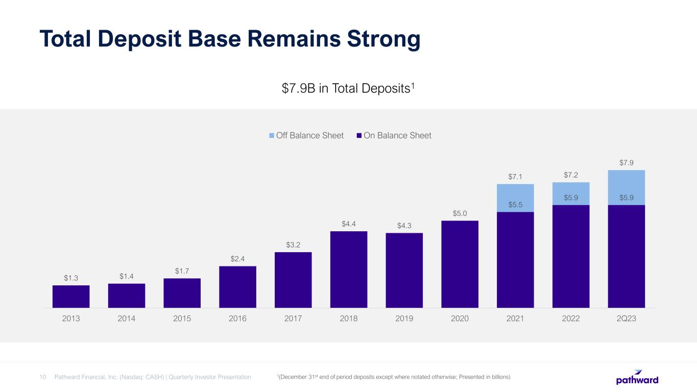 Second Quarter Results Driven by NIM Expansion and Growth in Noninterest Income Pathward Financial, Inc. (Nasdaq: CASH) | Quarterly Investor Presentation9 $83.8 $101.4 Q2 2022 Q2 2023 +21% Net Interest Income ($ in millions) 4.80% 6.12% Q2 2022 Q2 2023 +132 bps Total Net Interest Margin $109.8 $127.0 Q2 2022 Q2 2023 +16% Noninterest Income ($ in millions)