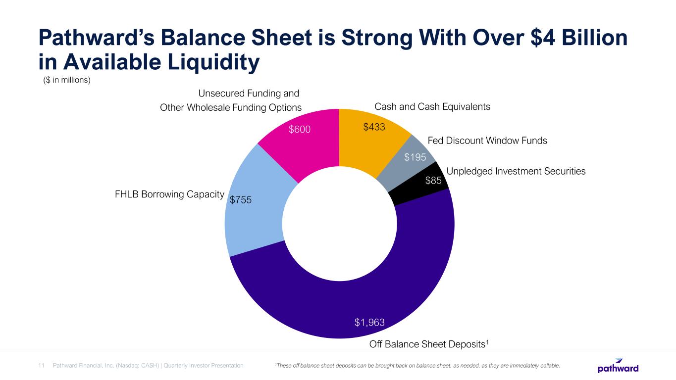 Total Deposit Base Remains Strong Pathward Financial, Inc. (Nasdaq: CASH) | Quarterly Investor Presentation10 $7.9B in Total Deposits1 $7.1 $7.2 $7.9 $1.3 $1.4 $1.7 $2.4 $3.2 $4.4 $4.3 $5.0 $5.5 $5.9 $5.9 2013 2014 2015 2016 2017 2018 2019 2020 2021 2022 2Q23 Off Balance Sheet On Balance Sheet 1(December 31st end of period deposits except where notated otherwise; Presented in billions)