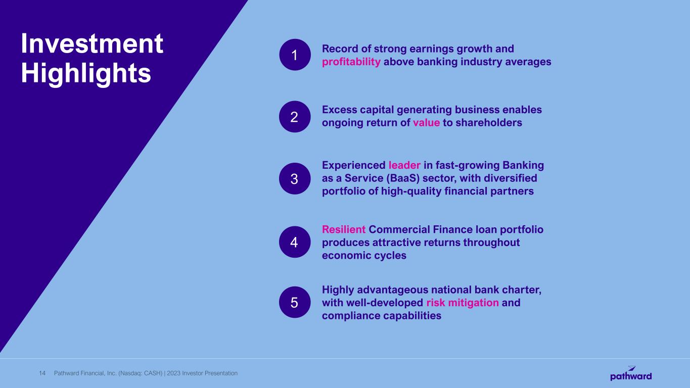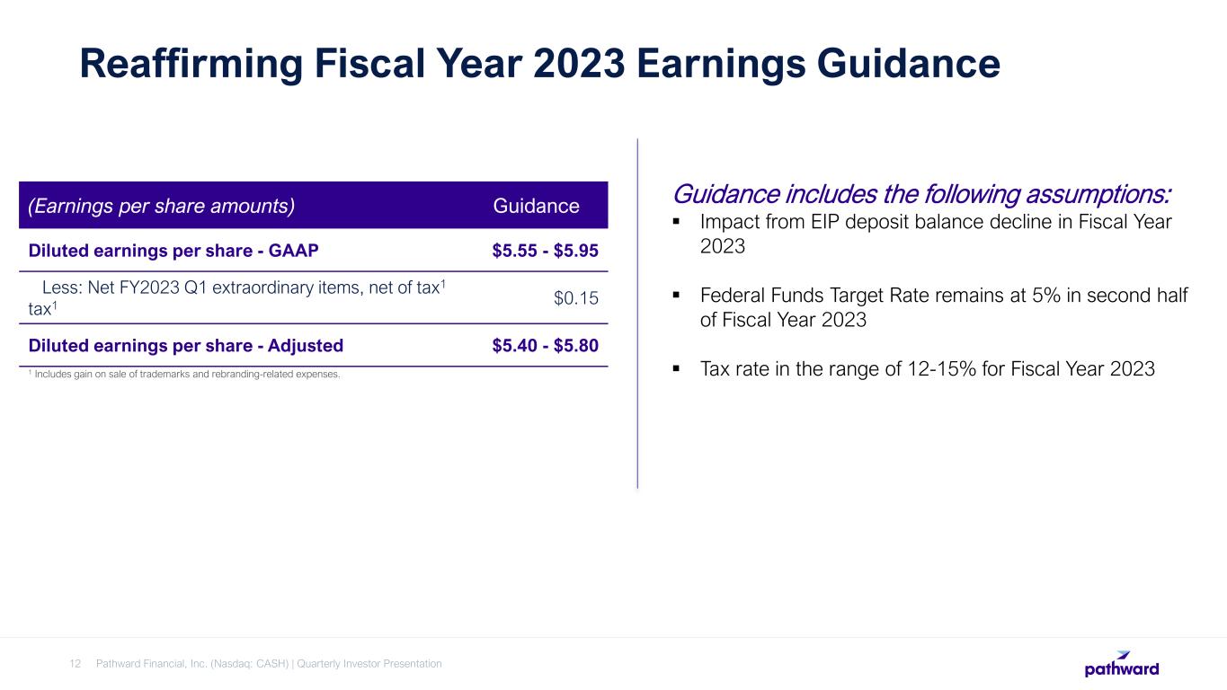 Pathward Financial, Inc. (Nasdaq: CASH) | Quarterly Investor Presentation12 Reaffirming Fiscal Year 2023 Earnings Guidance 1 Includes gain on sale of trademarks and rebranding-related expenses. (Earnings per share amounts) Guidance Diluted earnings per share - GAAP $5.55 - $5.95 Less: Net FY2023 Q1 extraordinary items, net of tax tax1 1 $0.15 Diluted earnings per share - Adjusted $5.40 - $5.80 Guidance includes the following assumptions:  Impact from EIP deposit balance decline in Fiscal Year 2023  Federal Funds Target Rate remains at 5% in second half of Fiscal Year 2023  Tax rate in the range of 12-15% for Fiscal Year 2023