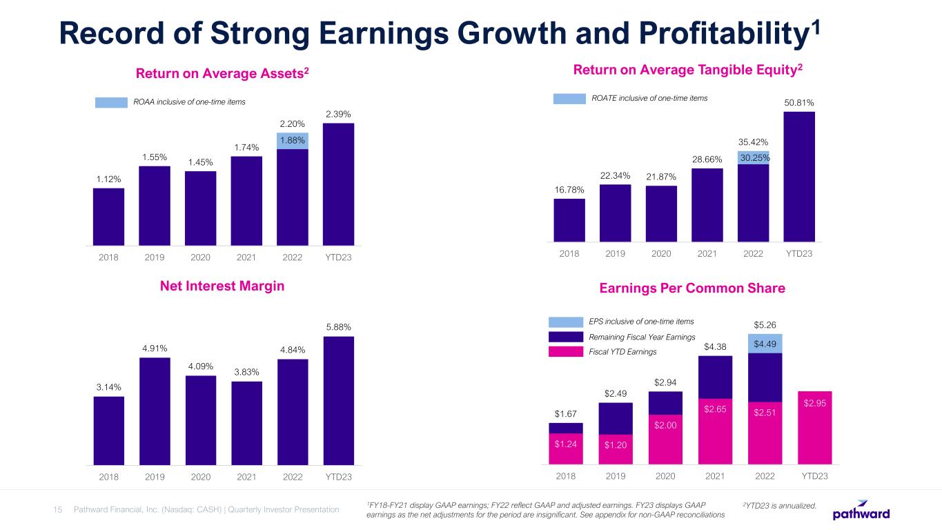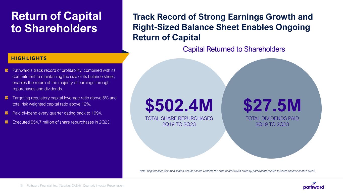 Pathward Financial, Inc. (Nasdaq: CASH) | Quarterly Investor Presentation15 Record of Strong Earnings Growth and Profitability1 2.20% 1.12% 1.55% 1.45% 1.74% 1.88% 2.39% 2018 2019 2020 2021 2022 YTD23 Return on Average Assets2 ROAA inclusive of one-time items Net Interest Margin Return on Average Tangible Equity2 35.42% 16.78% 22.34% 21.87% 28.66% 30.25% 50.81% 2018 2019 2020 2021 2022 YTD23 ROATE inclusive of one-time items Earnings Per Common Share $5.26 $1.67 $2.49 $2.94 $4.38 $4.49 $2.95 $1.24 $1.20 $2.00 $2.65 $2.51 2018 2019 2020 2021 2022 YTD23 EPS inclusive of one-time items 1FY18-FY21 display GAAP earnings; FY22 reflect GAAP and adjusted earnings. FY23 displays GAAP earnings as the net adjustments for the period are insignificant. See appendix for non-GAAP reconciliations 3.14% 4.91% 4.09% 3.83% 4.84% 5.88% 2018 2019 2020 2021 2022 YTD23 Fiscal YTD Earnings 2YTD23 is annualized. Remaining Fiscal Year Earnings