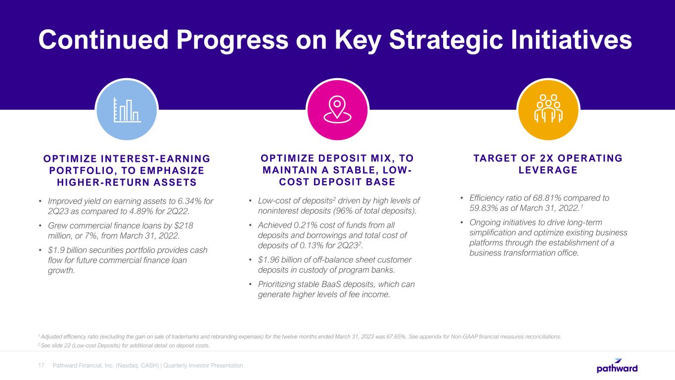 Pathward’s track record of profitability, combined with its commitment to maintaining the size of its balance sheet, enables the return of the majority of earnings through repurchases and dividends. Targeting regulatory capital leverage ratio above 8% and total risk weighted capital ratio above 12%. Paid dividend every quarter dating back to 1994. Executed $54.7 million of share repurchases in 2Q23. Pathward Financial, Inc, (Nasdaq: CASH) | Quarterly Investor Presentation16 Return of Capital to Shareholders HIGHLIGHTS Track Record of Strong Earnings Growth and Right-Sized Balance Sheet Enables Ongoing Return of Capital Capital Returned to Shareholders Note: Repurchased common shares include shares withheld to cover income taxes owed by participants related to share-based incentive plans. $502.4M TOTAL SHARE REPURCHASES 2Q19 TO 2Q23 $27.5M TOTAL DIVIDENDS PAID 2Q19 TO 2Q23