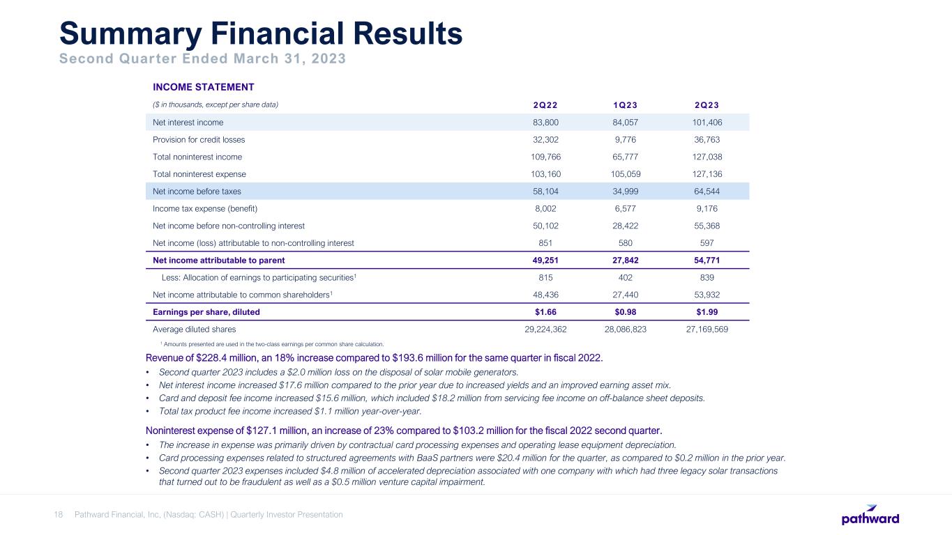 Pathward Financial, Inc. (Nasdaq: CASH) | Quarterly Investor Presentation17 Continued Progress on Key Strategic Initiatives OPTIMIZE INTEREST-EARNING PORTFOLIO, TO EMPHASIZE HIGHER-RETURN ASSETS • Improved yield on earning assets to 6.34% for 2Q23 as compared to 4.89% for 2Q22. • Grew commercial finance loans by $218 million, or 7%, from March 31, 2022. • $1.9 billion securities portfolio provides cash flow for future commercial finance loan growth. OPTIMIZE DEPOSIT MIX, TO MAINTAIN A STABLE, LOW- COST DEPOSIT BASE • Low-cost of deposits2 driven by high levels of noninterest deposits (96% of total deposits). • Achieved 0.21% cost of funds from all deposits and borrowings and total cost of deposits of 0.13% for 2Q232. • $1.96 billion of off-balance sheet customer deposits in custody of program banks. • Prioritizing stable BaaS deposits, which can generate higher levels of fee income. TARGET OF 2X OPER ATING LEVER AGE 1 Adjusted efficiency ratio (excluding the gain on sale of trademarks and rebranding expenses) for the twelve months ended March 31, 2023 was 67.65%. See appendix for Non-GAAP financial measures reconciliations. 2 See slide 22 (Low-cost Deposits) for additional detail on deposit costs. • Efficiency ratio of 68.81% compared to 59.83% as of March 31, 2022.1 • Ongoing initiatives to drive long-term simplification and optimize existing business platforms through the establishment of a business transformation office.