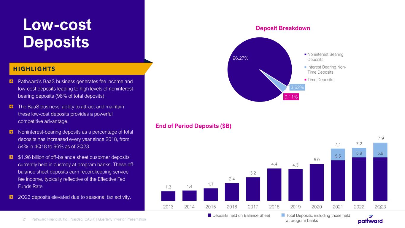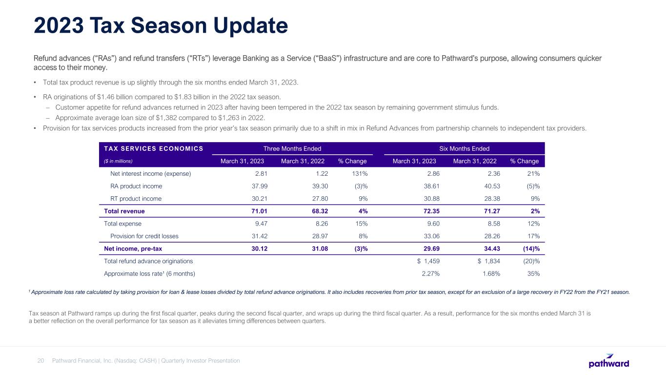 Pathward Financial, Inc. (Nasdaq: CASH) | Quarterly Investor Presentation20 2023 Tax Season Update Refund advances (“RAs”) and refund transfers (“RTs”) leverage Banking as a Service (“BaaS”) infrastructure and are core to Pathward’s purpose, allowing consumers quicker access to their money. • Total tax product revenue is up slightly through the six months ended March 31, 2023. • RA originations of $1.46 billion compared to $1.83 billion in the 2022 tax season. – Customer appetite for refund advances returned in 2023 after having been tempered in the 2022 tax season by remaining government stimulus funds. – Approximate average loan size of $1,382 compared to $1,263 in 2022. • Provision for tax services products increased from the prior year’s tax season primarily due to a shift in mix in Refund Advances from partnership channels to independent tax providers. Tax season at Pathward ramps up during the first fiscal quarter, peaks during the second fiscal quarter, and wraps up during the third fiscal quarter. As a result, performance for the six months ended March 31 is a better reflection on the overall performance for tax season as it alleviates timing differences between quarters. TAX SERVICES ECONOMICS Three Months Ended Six Months Ended ($ in millions) March 31, 2023 March 31, 2022 % Change March 31, 2023 March 31, 2022 % Change Net interest income (expense) 2.81 1.22 131% 2.86 2.36 21% RA product income 37.99 39.30 (3)% 38.61 40.53 (5)% RT product income 30.21 27.80 9% 30.88 28.38 9% Total revenue 71.01 68.32 4% 72.35 71.27 2% Total expense 9.47 8.26 15% 9.60 8.58 12% Provision for credit losses 31.42 28.97 8% 33.06 28.26 17% Net income, pre-tax 30.12 31.08 (3)% 29.69 34.43 (14)% Total refund advance originations $ 1,459 $ 1,834 (20)% Approximate loss rate¹ (6 months) 2.27% 1.68% 35% 1 Approximate loss rate calculated by taking provision for loan & lease losses divided by total refund advance originations. It also includes recoveries from prior tax season, except for an exclusion of a large recovery in FY22 from the FY21 season.
