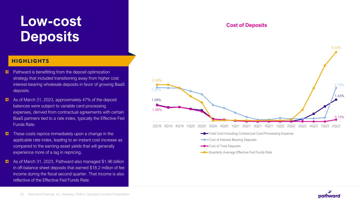 Deposits held on Balance Sheet Pathward’s BaaS business generates fee income and low-cost deposits leading to high levels of noninterest- bearing deposits (96% of total deposits). The BaaS business’ ability to attract and maintain these low-cost deposits provides a powerful competitive advantage. Noninterest-bearing deposits as a percentage of total deposits has increased every year since 2018, from 54% in 4Q18 to 96% as of 2Q23. $1.96 billion of off-balance sheet customer deposits currently held in custody at program banks. These off- balance sheet deposits earn recordkeeping service fee income, typically reflective of the Effective Fed Funds Rate. 2Q23 deposits elevated due to seasonal tax activity. Pathward Financial, Inc. (Nasdaq: CASH) | Quarterly Investor Presentation21 Low-cost Deposits HIGHLIGHTS Deposit Breakdown End of Period Deposits ($B) 7.1 7.2 7.9 1.3 1.4 1.7 2.4 3.2 4.4 4.3 5.0 5.5 5.9 5.9 2013 2014 2015 2016 2017 2018 2019 2020 2021 2022 2Q23 Total Deposits, including those held at program banks 96.27% 3.62% 0.11% Noninterest Bearing Deposits Interest Bearing Non- Time Deposits Time Deposits