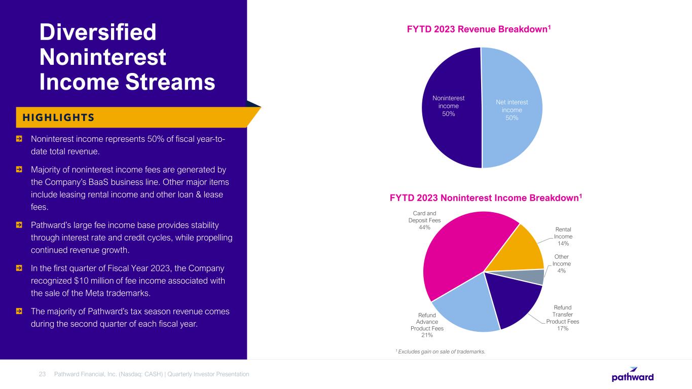 Pathward is benefitting from the deposit optimization strategy that included transitioning away from higher cost interest-bearing wholesale deposits in favor of growing BaaS deposits. As of March 31, 2023, approximately 47% of the deposit balances were subject to variable card processing expenses, derived from contractual agreements with certain BaaS partners tied to a rate index, typically the Effective Fed Funds Rate. These costs reprice immediately upon a change in the applicable rate index, leading to an instant cost increase as compared to the earning-asset yields that will generally experience more of a lag in repricing. As of March 31, 2023, Pathward also managed $1.96 billion in off-balance sheet deposits that earned $18.2 million of fee income during the fiscal second quarter. That income is also reflective of the Effective Fed Funds Rate. Pathward Financial, Inc. (Nasdaq: CASH) | Quarterly Investor Presentation22 Low-cost Deposits HIGHLIGHTS Cost of Deposits 1.09% 1.43% 2.22% 2.19% 1.06% 0.13% 2.40% 4.52% 2Q19 3Q19 4Q19 1Q20 2Q20 3Q20 4Q20 1Q21 2Q21 3Q21 4Q21 1Q22 2Q22 3Q22 4Q22 1Q23 2Q23 Total Cost Including Contractual Card Processing Expense Cost of Interest Bearing Deposits Cost of Total Deposits Quarterly Average Effective Fed Funds Rate