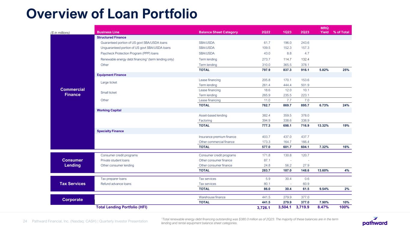 Pathward Financial, Inc. (Nasdaq: CASH) | Quarterly Investor Presentation 24 Overview of Loan Portfolio ($ in millions) Business Line Balance Sheet Category 2Q22 1Q23 2Q23 MRQ Yield % of Total Commercial Finance Structured Finance Guaranteed portion of US govt SBA/USDA loans SBA/USDA 61.7 196.0 243.6 Unguaranteed portion of US govt SBA/USDA loans SBA/USDA 109.5 152.3 157.3 Paycheck Protection Program (PPP) loans SBA/USDA 43.0 8.8 4.7 Renewable energy debt financing¹ (term lending only) Term lending 273.7 114.7 132.4 Other Term lending 310.0 365.5 378.1 TOTAL 797.9 837.3 916.1 5.82% 25% Equipment Finance Large ticket Lease financing 205.8 170.1 153.6 Term lending 261.4 444.4 501.9 Small ticket Lease financing 18.6 12.0 10.1 Term lending 265.9 235.5 223.1 Other Lease financing 11.0 7.7 7.0 TOTAL 762.7 869.7 895.7 6.73% 24% Working Capital Asset-based lending 382.4 359.5 378.0 Factoring 394.9 338.6 338.9 TOTAL 777.3 698.1 716.9 13.32% 19% Specialty Finance Insurance premium finance 403.7 437.0 437.7 Other commercial finance 173.3 164.7 166.4 TOTAL 577.0 601.7 604.1 7.32% 16% Consumer Lending Consumer credit programs Consumer credit programs 171.8 130.8 120.7 Private student loans Other consumer finance 87.1 - - Other consumer lending Other consumer finance 24.8 56.2 27.9 TOTAL 283.7 187.0 148.6 13.60% 4% Tax Services Tax preparer loans Tax services 5.9 30.4 0.6 Refund advance loans Tax services 80.1 - 60.9 TOTAL 86.0 30.4 61.5 9.54% 2% Corporate Warehouse finance 441.5 279.9 377.0 TOTAL 441.5 279.9 377.0 7.90% 10% Total Lending Portfolio (HFI) 3,726.1 3,504.1 3,719.9 8.47% 100% 1Total renewable energy debt financing outstanding was $380.0 million as of 2Q23. The majority of these balances are in the term lending and rental equipment balance sheet categories.