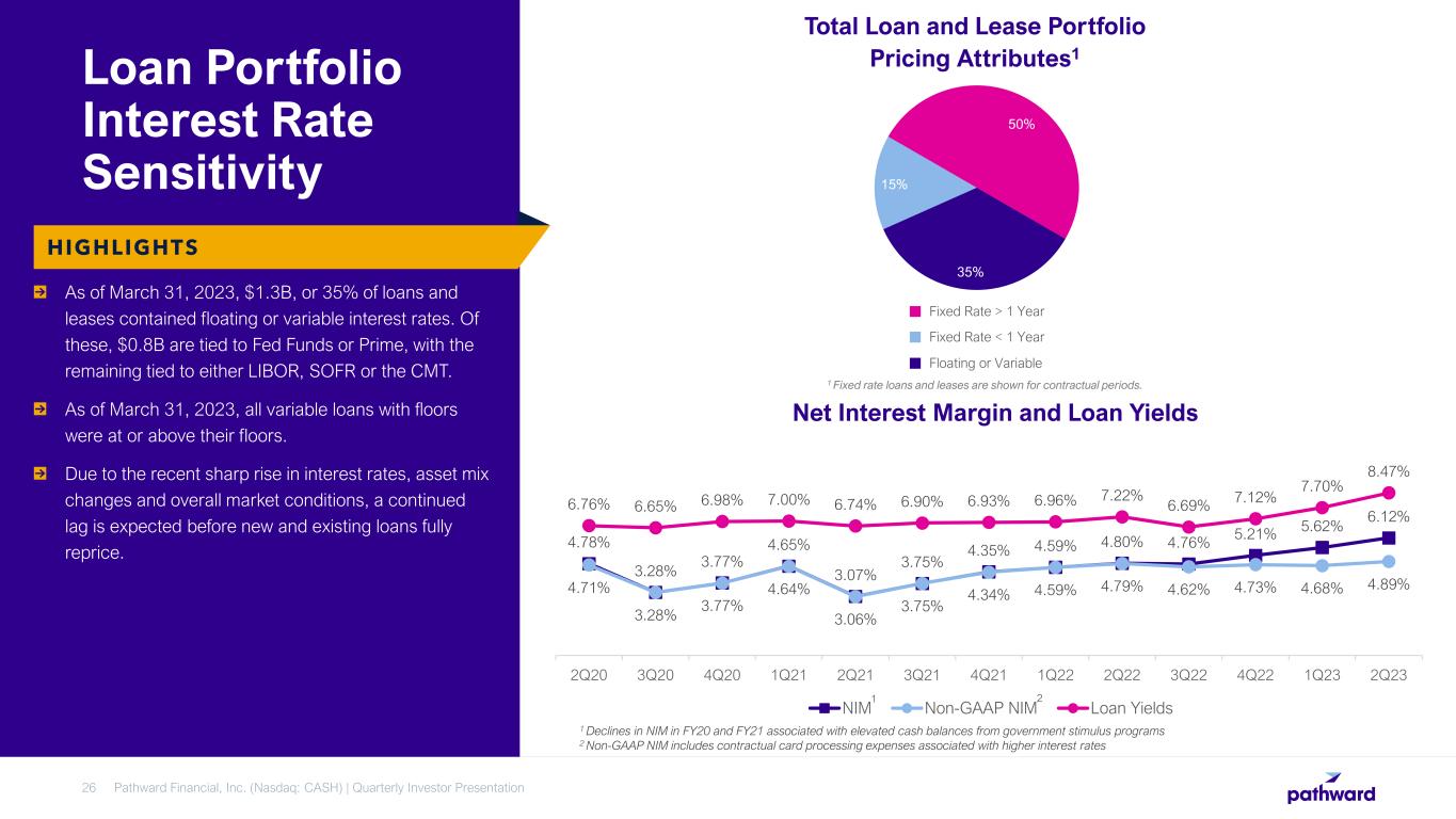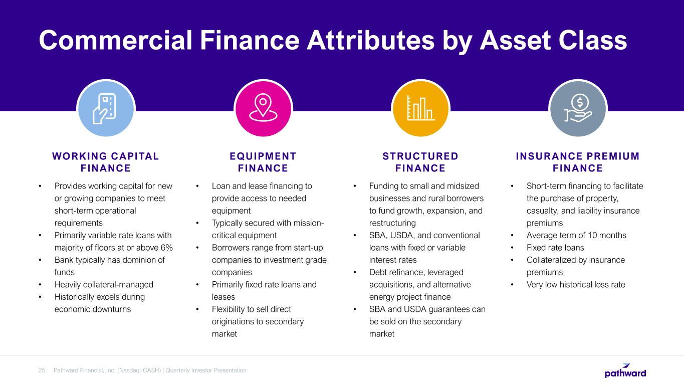 Pathward Financial, Inc. (Nasdaq: CASH) | Quarterly Investor Presentation25 Commercial Finance Attributes by Asset Class WORKING CAPITAL FINANCE • Provides working capital for new or growing companies to meet short-term operational requirements • Primarily variable rate loans with majority of floors at or above 6% • Bank typically has dominion of funds • Heavily collateral-managed • Historically excels during economic downturns EQUIPMENT FINANCE • Loan and lease financing to provide access to needed equipment • Typically secured with mission- critical equipment • Borrowers range from start-up companies to investment grade companies • Primarily fixed rate loans and leases • Flexibility to sell direct originations to secondary market STRUCTURED FINANCE • Funding to small and midsized businesses and rural borrowers to fund growth, expansion, and restructuring • SBA, USDA, and conventional loans with fixed or variable interest rates • Debt refinance, leveraged acquisitions, and alternative energy project finance • SBA and USDA guarantees can be sold on the secondary market INSUR ANCE PREMIUM FINANCE • Short-term financing to facilitate the purchase of property, casualty, and liability insurance premiums • Average term of 10 months • Fixed rate loans • Collateralized by insurance premiums • Very low historical loss rate