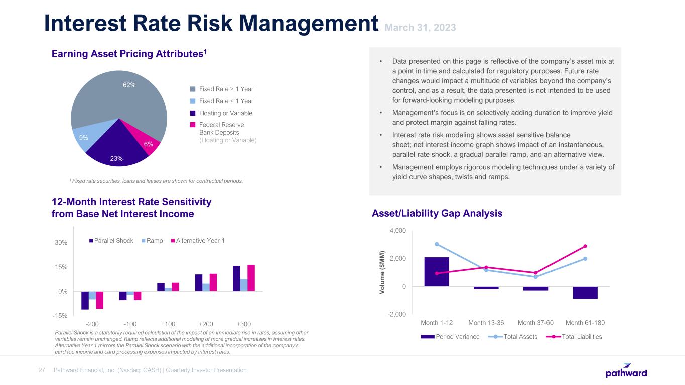 As of March 31, 2023, $1.3B, or 35% of loans and leases contained floating or variable interest rates. Of these, $0.8B are tied to Fed Funds or Prime, with the remaining tied to either LIBOR, SOFR or the CMT. As of March 31, 2023, all variable loans with floors were at or above their floors. Due to the recent sharp rise in interest rates, asset mix changes and overall market conditions, a continued lag is expected before new and existing loans fully reprice. Pathward Financial, Inc. (Nasdaq: CASH) | Quarterly Investor Presentation26 Loan Portfolio Interest Rate Sensitivity HIGHLIGHTS 1 Fixed rate loans and leases are shown for contractual periods. 35% 15% 50% Fixed Rate > 1 Year Total Loan and Lease Portfolio Pricing Attributes1 Fixed Rate < 1 Year Floating or Variable Net Interest Margin and Loan Yields 4.78% 3.28% 3.77% 4.65% 3.07% 3.75% 4.35% 4.59% 4.80% 4.76% 5.21% 5.62% 6.12% 4.71% 3.28% 3.77% 4.64% 3.06% 3.75% 4.34% 4.59% 4.79% 4.62% 4.73% 4.68% 4.89% 6.76% 6.65% 6.98% 7.00% 6.74% 6.90% 6.93% 6.96% 7.22% 6.69% 7.12% 7.70% 8.47% 2Q20 3Q20 4Q20 1Q21 2Q21 3Q21 4Q21 1Q22 2Q22 3Q22 4Q22 1Q23 2Q23 NIM Non-GAAP NIM Loan Yields 1 Declines in NIM in FY20 and FY21 associated with elevated cash balances from government stimulus programs 2 Non-GAAP NIM includes contractual card processing expenses associated with higher interest rates 1 2