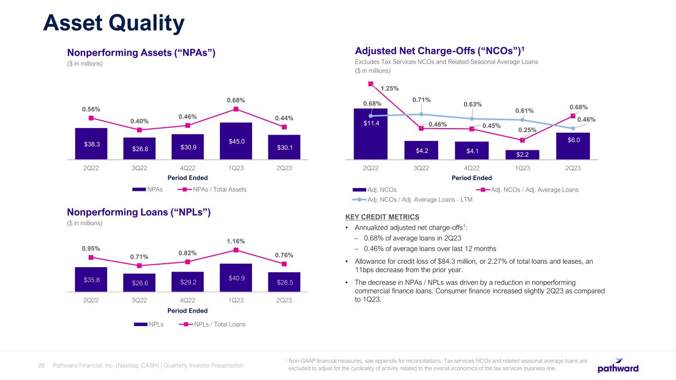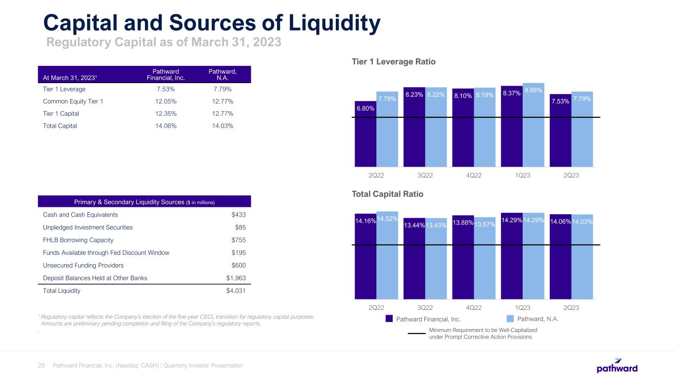 Pathward Financial, Inc. (Nasdaq: CASH) | Quarterly Investor Presentation28 Asset Quality $11.4 $4.2 $4.1 $2.2 $6.0 1.25% 0.46% 0.45% 0.25% 0.68%0.68% 0.71% 0.63% 0.61% 0.46% 2Q22 3Q22 4Q22 1Q23 2Q23 Period Ended Adj. NCOs Adj. NCOs / Adj. Average Loans Adj. NCOs / Adj. Average Loans - LTM Adjusted Net Charge-Offs (“NCOs”)1 Excludes Tax Services NCOs and Related Seasonal Average Loans ($ in millions) KEY CREDIT METRICS • Annualized adjusted net charge-offs1: – 0.68% of average loans in 2Q23 – 0.46% of average loans over last 12 months • Allowance for credit loss of $84.3 million, or 2.27% of total loans and leases, an 11bps decrease from the prior year. • The decrease in NPAs / NPLs was driven by a reduction in nonperforming commercial finance loans. Consumer finance increased slightly 2Q23 as compared to 1Q23. $38.3 $26.8 $30.9 $45.0 $30.1 0.56% 0.40% 0.46% 0.68% 0.44% 2Q22 3Q22 4Q22 1Q23 2Q23 Period Ended NPAs NPAs / Total Assets 1 Non-GAAP financial measures, see appendix for reconciliations. Tax services NCOs and related seasonal average loans are excluded to adjust for the cyclicality of activity related to the overall economics of the tax services business line. $35.8 $26.6 $29.2 $40.9 $28.5 0.95% 0.71% 0.82% 1.16% 0.76% 2Q22 3Q22 4Q22 1Q23 2Q23 Period Ended NPLs NPLs / Total Loans Nonperforming Assets (“NPAs”) ($ in millions) Nonperforming Loans (“NPLs”) ($ in millions)