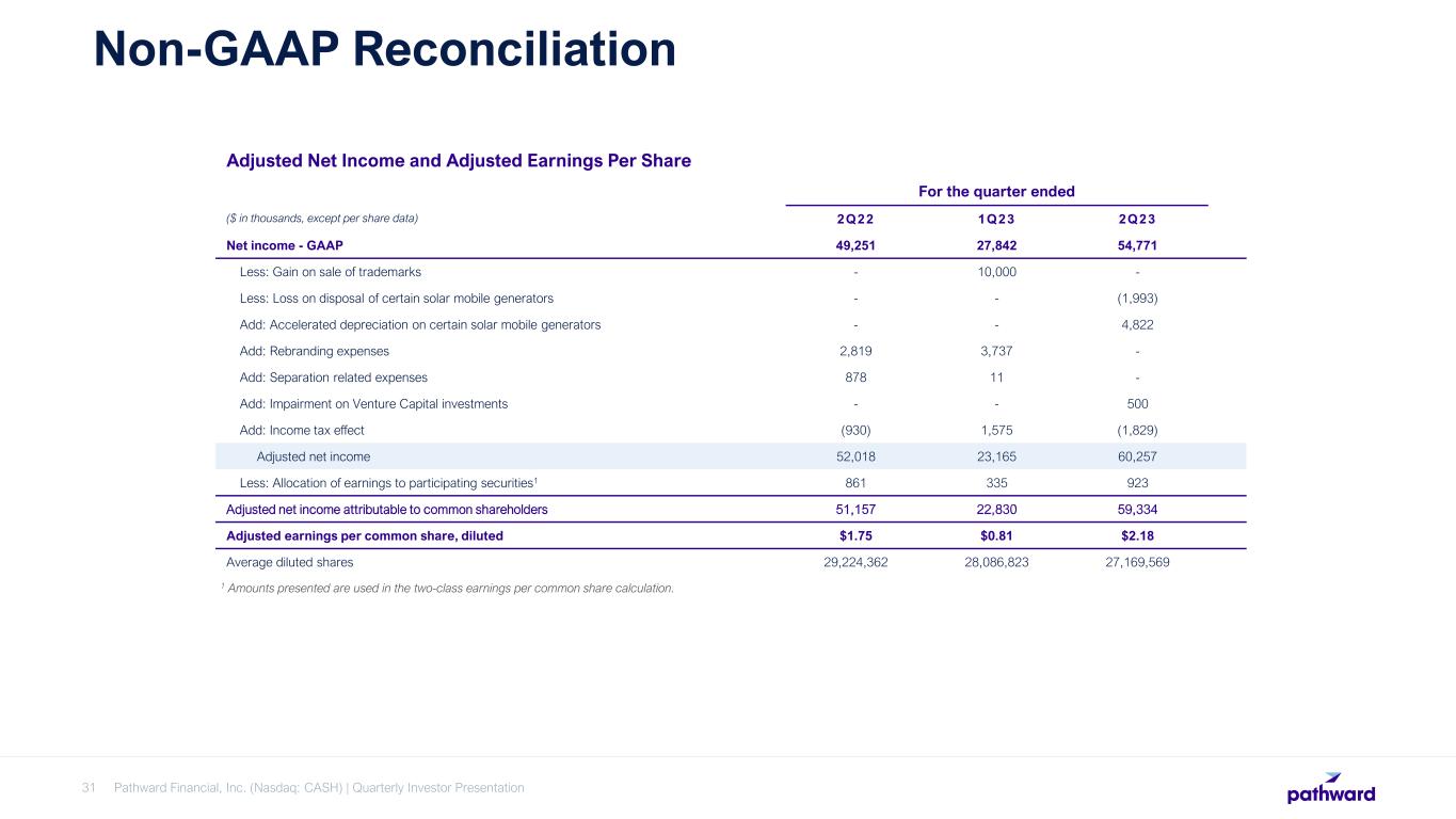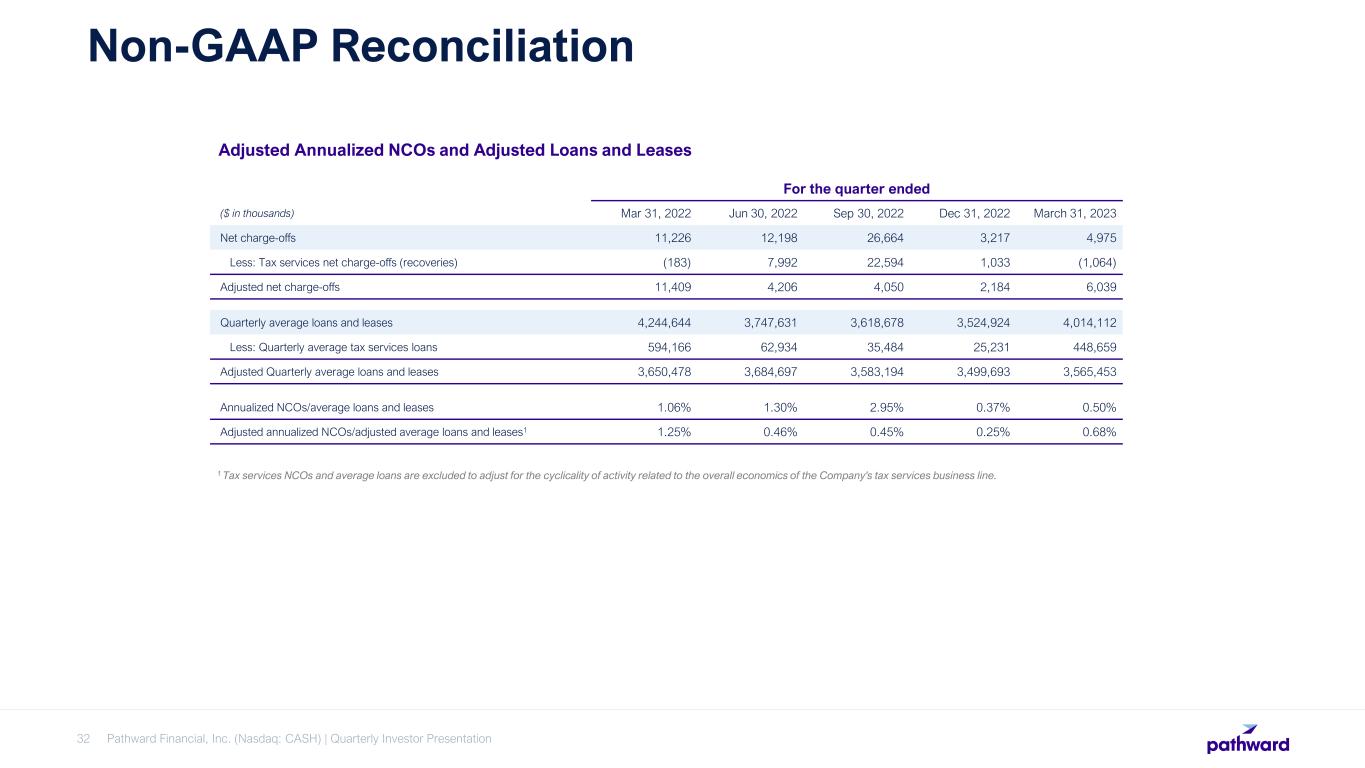 Pathward Financial, Inc. (Nasdaq: CASH) | Quarterly Investor Presentation31 Non-GAAP Reconciliation Adjusted Net Income and Adjusted Earnings Per Share For the quarter ended ($ in thousands, except per share data) 2Q22 1Q23 2Q23 Net income - GAAP 49,251 27,842 54,771 Less: Gain on sale of trademarks - 10,000 - Less: Loss on disposal of certain solar mobile generators - - (1,993) Add: Accelerated depreciation on certain solar mobile generators - - 4,822 Add: Rebranding expenses 2,819 3,737 - Add: Separation related expenses 878 11 - Add: Impairment on Venture Capital investments - - 500 Add: Income tax effect (930) 1,575 (1,829) Adjusted net income 52,018 23,165 60,257 Less: Allocation of earnings to participating securities1 861 335 923 Adjusted net income attributable to common shareholders 51,157 22,830 59,334 Adjusted earnings per common share, diluted $1.75 $0.81 $2.18 Average diluted shares 29,224,362 28,086,823 27,169,569 1 Amounts presented are used in the two-class earnings per common share calculation.