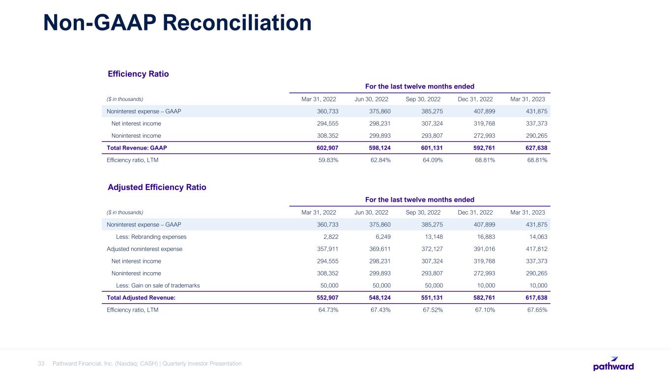 Pathward Financial, Inc. (Nasdaq: CASH) | Quarterly Investor Presentation32 Non-GAAP Reconciliation 1 Tax services NCOs and average loans are excluded to adjust for the cyclicality of activity related to the overall economics of the Company's tax services business line. For the quarter ended ($ in thousands) Mar 31, 2022 Jun 30, 2022 Sep 30, 2022 Dec 31, 2022 March 31, 2023 Net charge-offs 11,226 12,198 26,664 3,217 4,975 Less: Tax services net charge-offs (recoveries) (183) 7,992 22,594 1,033 (1,064) Adjusted net charge-offs 11,409 4,206 4,050 2,184 6,039 Quarterly average loans and leases 4,244,644 3,747,631 3,618,678 3,524,924 4,014,112 Less: Quarterly average tax services loans 594,166 62,934 35,484 25,231 448,659 Adjusted Quarterly average loans and leases 3,650,478 3,684,697 3,583,194 3,499,693 3,565,453 Annualized NCOs/average loans and leases 1.06% 1.30% 2.95% 0.37% 0.50% Adjusted annualized NCOs/adjusted average loans and leases1 1.25% 0.46% 0.45% 0.25% 0.68% Adjusted Annualized NCOs and Adjusted Loans and Leases