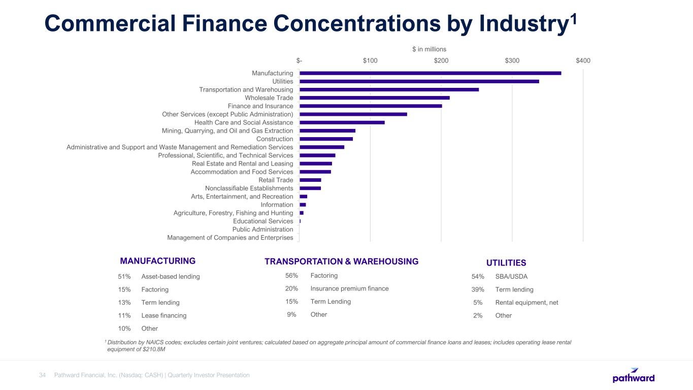 Pathward Financial, Inc. (Nasdaq: CASH) | Quarterly Investor Presentation34 Commercial Finance Concentrations by Industry1 Manufacturing Utilities Transportation and Warehousing Wholesale Trade Finance and Insurance Other Services (except Public Administration) Health Care and Social Assistance Mining, Quarrying, and Oil and Gas Extraction Construction Administrative and Support and Waste Management and Remediation Services Professional, Scientific, and Technical Services Real Estate and Rental and Leasing Accommodation and Food Services Retail Trade Nonclassifiable Establishments Arts, Entertainment, and Recreation Information Agriculture, Forestry, Fishing and Hunting Educational Services Public Administration Management of Companies and Enterprises $- $100 $200 $300 $400 $ in millions 1 Distribution by NAICS codes; excludes certain joint ventures; calculated based on aggregate principal amount of commercial finance loans and leases; includes operating lease rental equipment of $210.8M MANUFACTURING 51% Asset-based lending 15% Factoring 13% Term lending 11% Lease financing 10% Other TRANSPORTATION & WAREHOUSING 56% Factoring 20% Insurance premium finance 15% Term Lending 9% Other UTILITIES 54% SBA/USDA 39% Term lending 5% Rental equipment, net 2% Other
