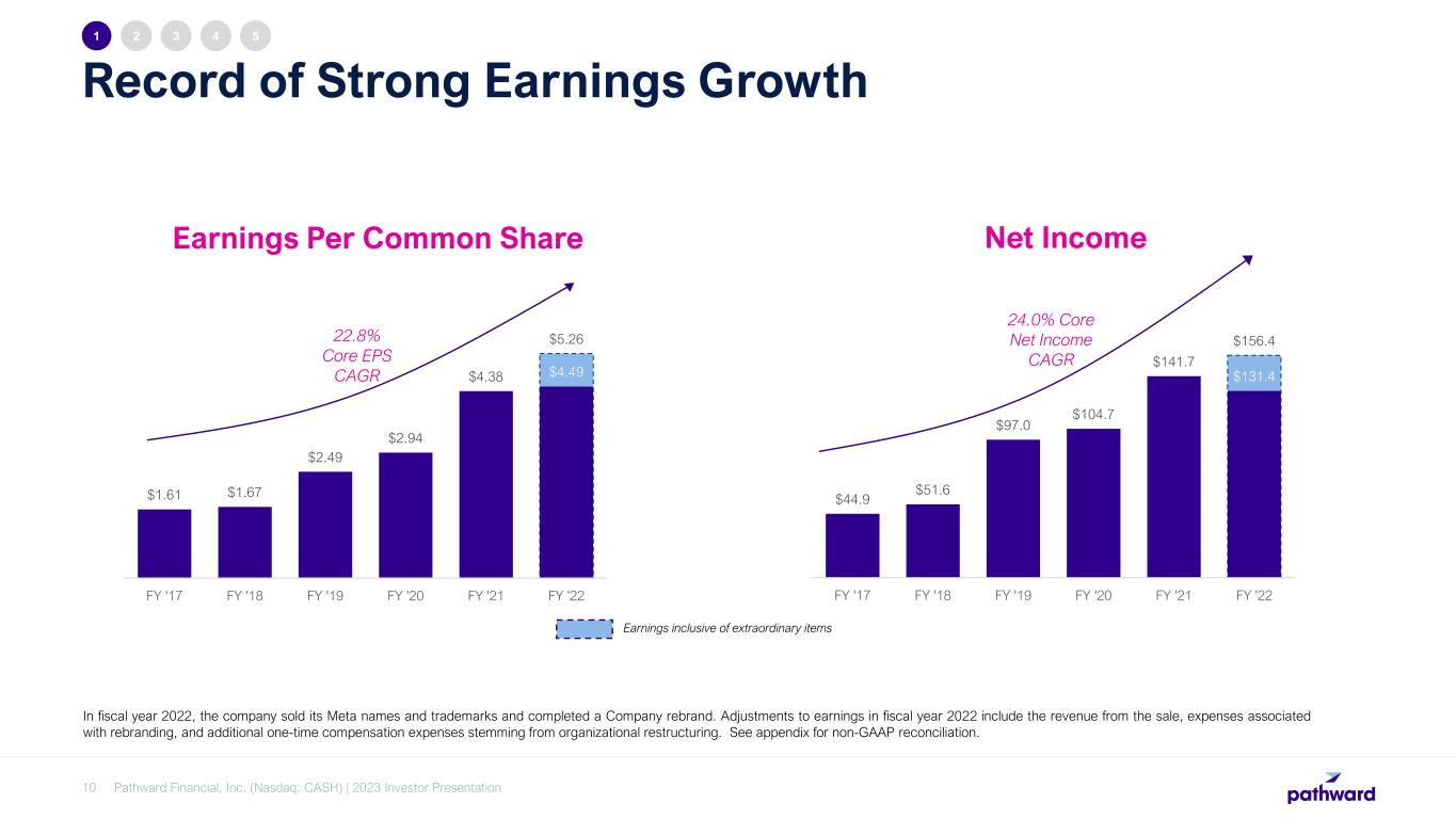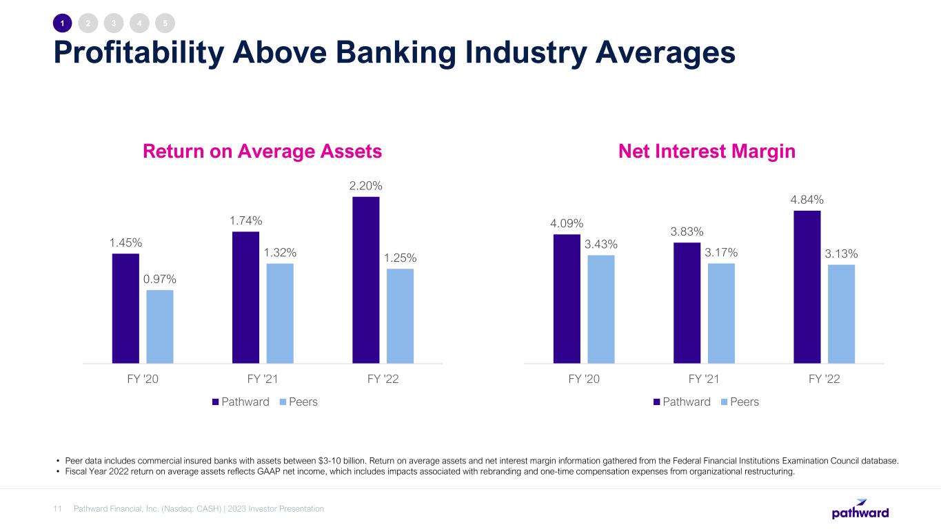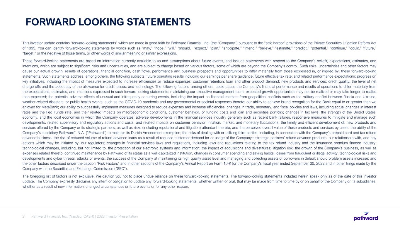 Pathward Financial, Inc. (Nasdaq: CASH) | 2023 Investor Presentation2 FORWARD LOOKING STATEMENTS This investor update contains “forward-looking statements” which are made in good faith by Pathward Financial, Inc. (the “Company”) pursuant to the “safe harbor” provisions of the Private Securities Litigation Reform Act of 1995. You can identify forward-looking statements by words such as “may,” “hope,” “will,” “should,” “expect,” “plan,” “anticipate,” “intend,” “believe,” “estimate,” “predict,” “potential,” “continue,” “could,” “future,” “target,” or the negative of those terms, or other words of similar meaning or similar expressions. These forward-looking statements are based on information currently available to us and assumptions about future events, and include statements with respect to the Company’s beliefs, expectations, estimates, and intentions, which are subject to significant risks and uncertainties, and are subject to change based on various factors, some of which are beyond the Company’s control. Such risks, uncertainties and other factors may cause our actual growth, results of operations, financial condition, cash flows, performance and business prospects and opportunities to differ materially from those expressed in, or implied by, these forward-looking statements. Such statements address, among others, the following subjects: future operating results including our earnings per share guidance, future effective tax rate, and related performance expectations; progress on key initiatives, including the impact of measures expected to increase efficiencies or reduce expenses; customer retention; loan and other product demand; new products and services; credit quality; the level of net charge-offs and the adequacy of the allowance for credit losses; and technology. The following factors, among others, could cause the Company's financial performance and results of operations to differ materially from the expectations, estimates, and intentions expressed in such forward-looking statements: maintaining our executive management team; expected growth opportunities may not be realized or may take longer to realize than expected; the potential adverse effects of unusual and infrequently occurring events, including the impact on financial markets from geopolitical conflicts such as the military conflict between Russia and Ukraine, weather-related disasters, or public health events, such as the COVID-19 pandemic and any governmental or societal responses thereto; our ability to achieve brand recognition for the Bank equal to or greater than we enjoyed for MetaBank; our ability to successfully implement measures designed to reduce expenses and increase efficiencies; changes in trade, monetary, and fiscal policies and laws, including actual changes in interest rates and the Fed Funds rate, and their related impacts on macroeconomic conditions, customer behavior, or funding costs and loan and securities portfolio; changes in tax laws; the strength of the United States' economy, and the local economies in which the Company operates; adverse developments in the financial services industry generally such as recent bank failures, responsive measures to mitigate and manage such developments, related supervisory and regulatory actions and costs, and related impacts on customer behavior; inflation, market, and monetary fluctuations; the timely and efficient development of, new products and services offered by the Company or its strategic partners, as well as risks (including reputational and litigation) attendant thereto, and the perceived overall value of these products and services by users; the ability of the Company’s subsidiary Pathward®, N.A. (“Pathward”) to maintain its Durbin Amendment exemption; the risks of dealing with or utilizing third parties, including, in connection with the Company’s prepaid card and tax refund advance business, the risk of reduced volume of refund advance loans as a result of reduced customer demand for or usage of the Company’s strategic partners’ refund advance products; our relationship with, and any actions which may be initiated by, our regulators; changes in financial services laws and regulations, including laws and regulations relating to the tax refund industry and the insurance premium finance industry; technological changes, including, but not limited to, the protection of our electronic systems and information; the impact of acquisitions and divestitures; litigation risk; the growth of the Company’s business, as well as expenses related thereto; continued maintenance by Pathward of its status as a well-capitalized institution, changes in consumer spending and saving habits; losses from fraudulent or illegal activity, technological risks and developments and cyber threats, attacks or events; the success of the Company at maintaining its high quality asset level and managing and collecting assets of borrowers in default should problem assets increase; and the other factors described under the caption “Risk Factors” and in other sections of the Company’s Annual Report on Form 10-K for the Company's fiscal year ended September 30, 2022 and in other filings made by the Company with the Securities and Exchange Commission (“SEC”). The foregoing list of factors is not exclusive. We caution you not to place undue reliance on these forward-looking statements. The forward-looking statements included herein speak only as of the date of this investor update. The Company expressly disclaims any intent or obligation to update any forward-looking statements, whether written or oral, that may be made from time to time by or on behalf of the Company or its subsidiaries, whether as a result of new information, changed circumstances or future events or for any other reason.