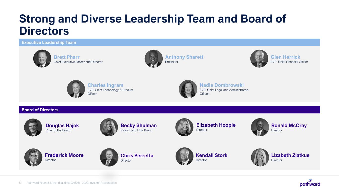 Pathward Financial, Inc. (Nasdaq: CASH) | 2023 Investor Presentation7 Commercial Finance Helps Businesses Access Needed Funds Through Various Solutions Working Capital Finance Equipment Finance Structured Finance Insurance Premium Finance Ready cash for liquidity needs to new or growing companies in cyclical or seasonal industries Providing access to equipment financing, through loans and leases, without sacrificing cash flows Assisting small and mid-sized businesses and rural borrowers with primarily SBA and USDA lending to fund growth, expansion and refinancing Short-term financing for purchase of property, casualty, and liability insurance premiums