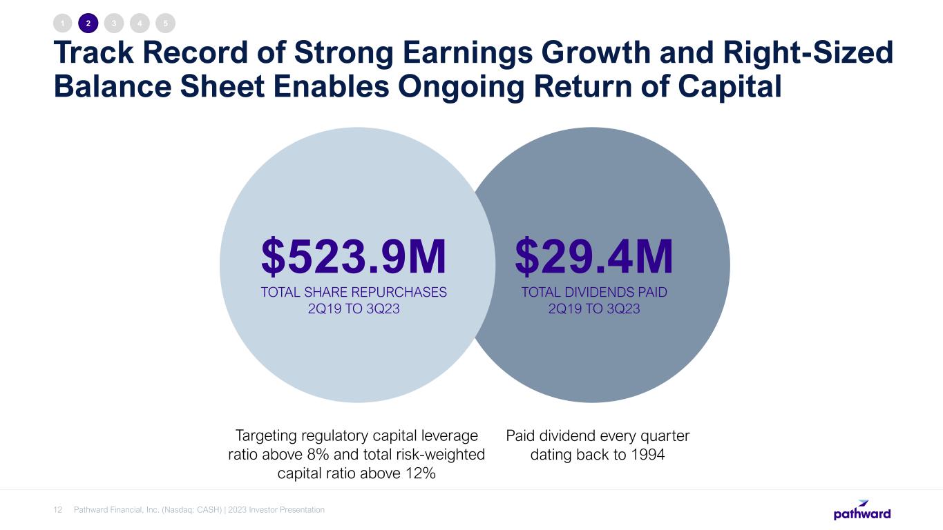Profitability Above Banking Industry Averages Pathward Financial, Inc. (Nasdaq: CASH) | 2023 Investor Presentation11 1 2 3 4 5 • Peer data includes commercial insured banks with assets between $3-10 billion. Return on average assets and net interest margin information gathered from the Federal Financial Institutions Examination Council database. • Fiscal Year 2022 return on average assets reflects GAAP net income, which includes impacts associated with rebranding and one-time compensation expenses from organizational restructuring. 1.45% 1.74% 2.20% 0.97% 1.32% 1.25% FY '20 FY '21 FY '22 Pathward Peers Return on Average Assets 4.09% 3.83% 4.84% 3.43% 3.17% 3.13% FY '20 FY '21 FY '22 Pathward Peers Net Interest Margin