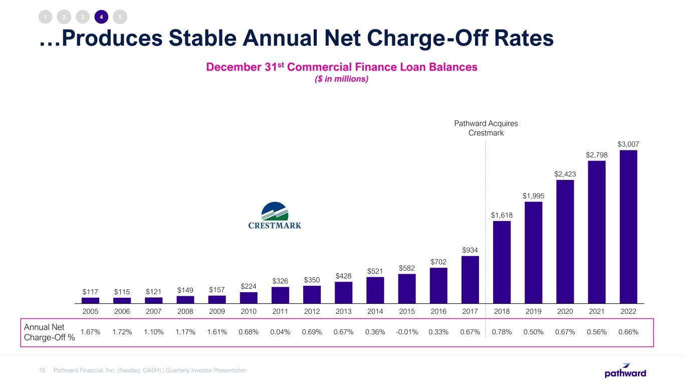…Produces Stable Annual Net Charge-Off Rates Pathward Financial, Inc. (Nasdaq: CASH) | Quarterly Investor Presentation16 Pathward Acquires Crestmark December 31st Commercial Finance Loan Balances ($ in millions) $117 $115 $121 $149 $157 $224 $326 $350 $428 $521 $582 $702 $934 $1,618 $1,995 $2,423 $2,798 $3,007 0.0 0.1 0.2 0.3 0.4 0.5 0.6 0.7 0.8 0.9 1.0 0 500 1,000 1,500 2,000 2,500 3,000 3,500 2005 1.67% 2006 1.72% 2007 1.10% 2008 1.17% 2009 1.61% 2010 0.68% 2011 0.04% 2012 0.69% 2013 0.67% 2014 0.36% 2015 -0.01% 2016 0.33% 2017 0.67% 2018 0.78% 2019 0.50% 2020 0.67% 2021 0.56% 2022 0.66% Annual Net Charge-Off % 1 2 3 4 5