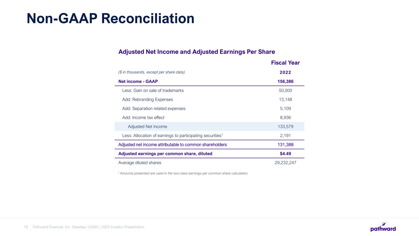 Pathward Financial, Inc. (Nasdaq: CASH) | 2023 Investor Presentation19 Adjusted Net Income and Adjusted Earnings Per Share Fiscal Year ($ in thousands, except per share data) 2022 Net income - GAAP 156,386 Less: Gain on sale of trademarks 50,000 Add: Rebranding Expenses 13,148 Add: Separation related expenses 5,109 Add: Income tax effect 8,936 Adjusted Net Income 133,579 Less: Allocation of earnings to participating securities1 2,191 Adjusted net income attributable to common shareholders 131,388 Adjusted earnings per common share, diluted $4.49 Average diluted shares 29,232,247 1 Amounts presented are used in the two-class earnings per common share calculation. Non-GAAP Reconciliation