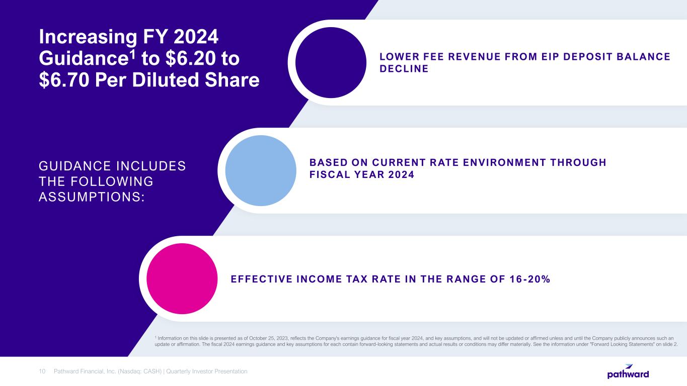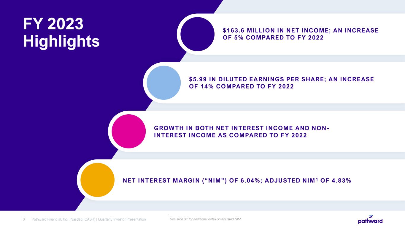 Pathward Financial, Inc. (Nasdaq: CASH) | Quarterly Investor Presentation2 FORWARD LOOKING STATEMENTS This investor update contains “forward-looking statements” which are made in good faith by Pathward Financial, Inc.TM (the “Company”) pursuant to the “safe harbor” provisions of the Private Securities Litigation Reform Act of 1995. You can identify forward-looking statements by words such as “may,” “hope,” “will,” “should,” “expect,” “plan,” “anticipate,” “intend,” “believe,” “estimate,” “predict,” “potential,” “continue,” “could,” “future,” “target,” or the negative of those terms, or other words of similar meaning or similar expressions. These forward-looking statements are based on information currently available to us and assumptions about future events, and include statements with respect to the Company’s beliefs, expectations, estimates, and intentions, which are subject to significant risks and uncertainties, and are subject to change based on various factors, some of which are beyond the Company’s control. Such risks, uncertainties and other factors may cause our actual growth, results of operations, financial condition, cash flows, performance and business prospects and opportunities to differ materially from those expressed in, or implied by, these forward-looking statements. Such statements address, among others, the following subjects: future operating results including our earnings per share guidance, future effective tax rate, and related performance expectations; progress on key initiatives, including the impact of measures expected to increase efficiencies or reduce expenses; customer retention; loan and other product demand; new products and services; credit quality; the level of net charge-offs and the adequacy of the allowance for credit losses; and technology. The following factors, among others, could cause the Company's financial performance and results of operations to differ materially from the expectations, estimates, and intentions expressed in such forward-looking statements: maintaining our executive management team; expected growth opportunities may not be realized or may take longer to realize than expected; the potential adverse effects of unusual and infrequently occurring events, including the impact on financial markets from geopolitical conflicts such as the military conflicts in Ukraine and the Middle East, weather-related disasters, or public health events, such as the COVID-19 pandemic and any governmental or societal responses thereto; our ability to achieve brand recognition for the Bank equal to or greater than we enjoyed for MetaBank; our ability to successfully implement measures designed to reduce expenses and increase efficiencies; changes in trade, monetary, and fiscal policies and laws, including actual changes in interest rates and the Fed Funds rate, and their related impacts on macroeconomic conditions, customer behavior, or funding costs and loan and securities portfolio; changes in tax laws; the strength of the United States' economy, and the local economies in which the Company operates; adverse developments in the financial services industry generally such as recent bank failures, responsive measures to mitigate and manage such developments, related supervisory and regulatory actions and costs, and related impacts on customer behavior; inflation, market, and monetary fluctuations; the timely and efficient development of, new products and services offered by the Company or its strategic partners, as well as risks (including reputational and litigation) attendant thereto, and the perceived overall value of these products and services by users; the ability of the Company’s subsidiary Pathward™, N.A. (“Pathward”) to maintain its Durbin Amendment exemption; the risks of dealing with or utilizing third parties, including, in connection with the Company’s prepaid card and tax refund advance business, the risk of reduced volume of refund advance loans as a result of reduced customer demand for or usage of the Company’s strategic partners’ refund advance products; our relationship with, and any actions which may be initiated by, our regulators; changes in financial services laws and regulations, including laws and regulations relating to the tax refund industry and the insurance premium finance industry; technological changes, including, but not limited to, the protection of our electronic systems and information; the impact of acquisitions and divestitures; litigation risk; the growth of the Company’s business, as well as expenses related thereto; continued maintenance by Pathward of its status as a well-capitalized institution, changes in consumer spending and saving habits; losses from fraudulent or illegal activity, technological risks and developments and cyber threats, attacks or events; the success of the Company at maintaining its high quality asset level and managing and collecting assets of borrowers in default should problem assets increase; and the other factors described under the caption “Risk Factors” and in other sections of the Company’s Annual Report on Form 10-K for the Company's fiscal year ended September 30, 2022 and in other filings made by the Company with the Securities and Exchange Commission (“SEC”). The foregoing list of factors is not exclusive. We caution you not to place undue reliance on these forward-looking statements. The forward-looking statements included herein speak only as of the date of this investor update. The Company expressly disclaims any intent or obligation to update any forward-looking statements, whether written or oral, that may be made from time to time by or on behalf of the Company or its subsidiaries, whether as a result of new information, changed circumstances or future events or for any other reason.
