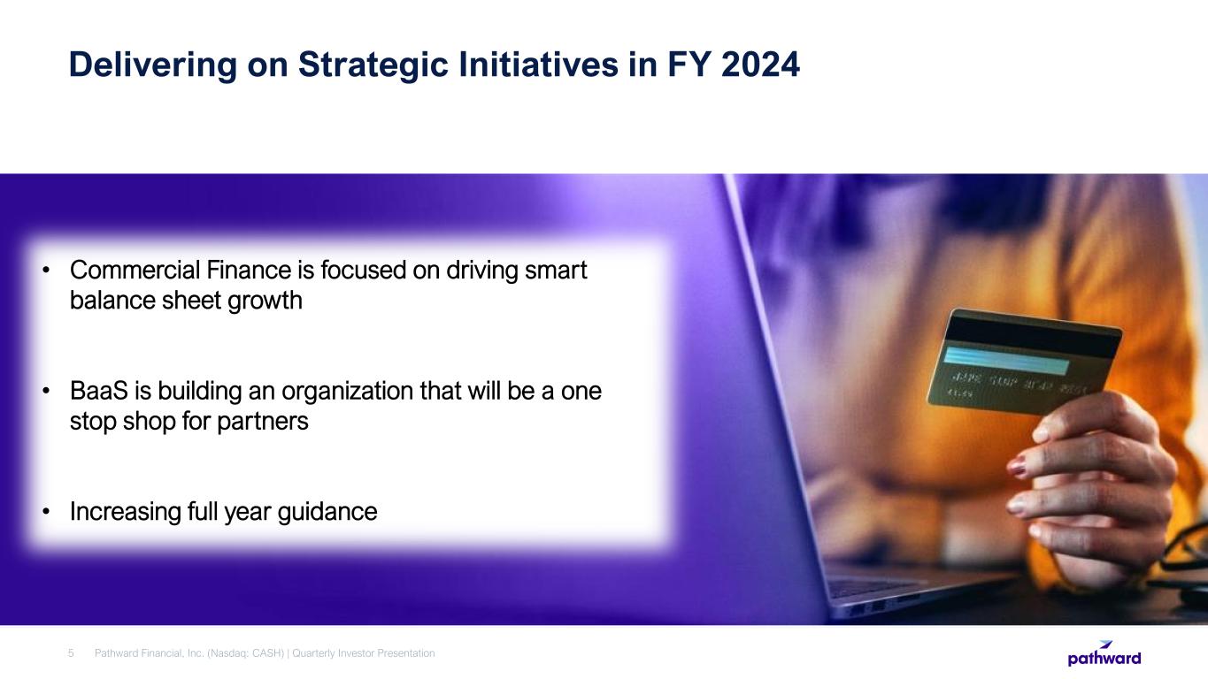 Fiscal Year 2023 Accomplishments Pathward Financial, Inc. (Nasdaq: CASH) | Quarterly Investor Presentation4 • Certified Great Place to Work and Newsweek ranked Pathward among America’s Greatest Workplaces • Commercial Finance grew total loans and leases by 23% • BaaS extended multiple agreements and launched new programs with both new and existing partners • Commercial Finance held organizational review to create horizontal capabilities and drive efficiencies • Regulatory, Risk and Compliance maturity and infrastructure is a strength