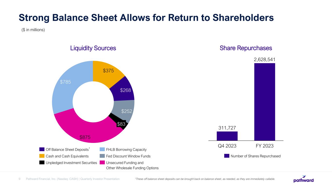 ▪ Growth primari ly driven by Insurance Premium Finance, Term Lending and SBA/USDA ▪ Credit qual ity remains strong ▪ Nonperforming loans and leases of 1.26% compared to 0.93% Q3 2023 ▪ Annualized adjusted net charge - off rate of 0.49% for 4Q23 1 Pathward Financial, Inc. (Nasdaq: CASH) | Quarterly Investor Presentation8 Total Loans and Leases Increased from Q4 2022 $3,529.3 $4,359.7 Q4 2022 Q4 2023 +24% Total Loans and Leases Period ending ($ in millions) 1 See slide 29 (Non-GAAP reconciliation) for additional detail.