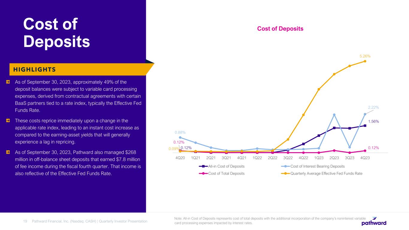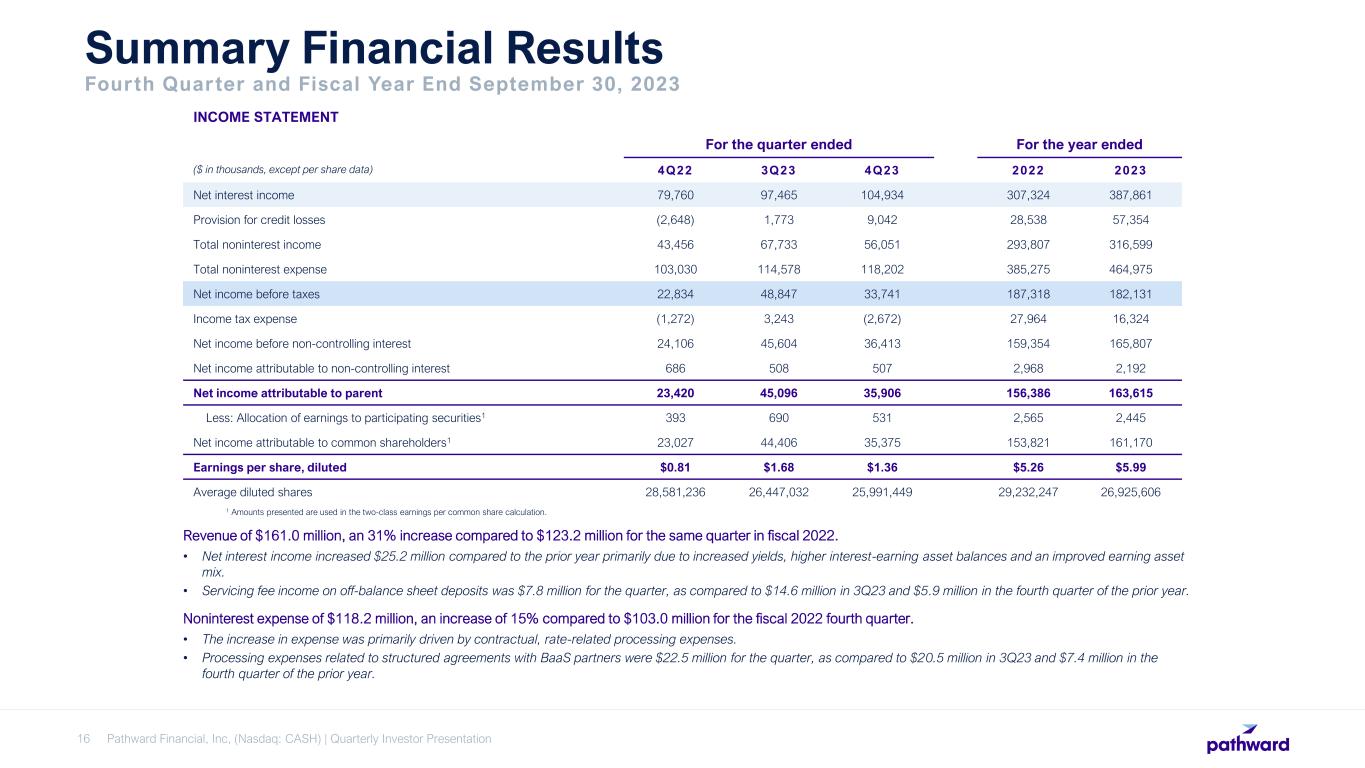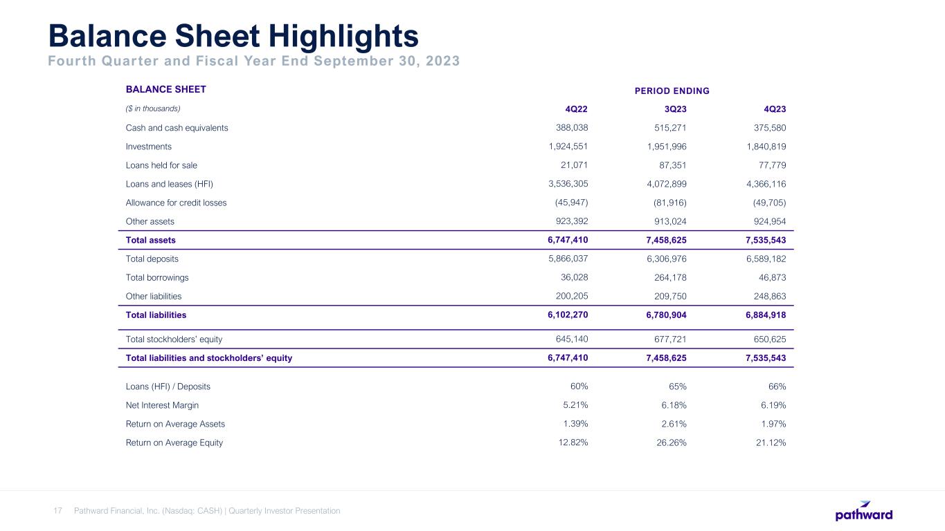 Pathward Financial, Inc, (Nasdaq: CASH) | Quarterly Investor Presentation16 Summary Financial Results Fourth Quarter and Fiscal Year End September 30, 2023 INCOME STATEMENT For the quarter ended For the year ended ($ in thousands, except per share data) 4Q22 3Q23 4Q23 2022 2023 Net interest income 79,760 97,465 104,934 307,324 387,861 Provision for credit losses (2,648) 1,773 9,042 28,538 57,354 Total noninterest income 43,456 67,733 56,051 293,807 316,599 Total noninterest expense 103,030 114,578 118,202 385,275 464,975 Net income before taxes 22,834 48,847 33,741 187,318 182,131 Income tax expense (1,272) 3,243 (2,672) 27,964 16,324 Net income before non-controlling interest 24,106 45,604 36,413 159,354 165,807 Net income attributable to non-controlling interest 686 508 507 2,968 2,192 Net income attributable to parent 23,420 45,096 35,906 156,386 163,615 Less: Allocation of earnings to participating securities1 393 690 531 2,565 2,445 Net income attributable to common shareholders1 23,027 44,406 35,375 153,821 161,170 Earnings per share, diluted $0.81 $1.68 $1.36 $5.26 $5.99 Average diluted shares 28,581,236 26,447,032 25,991,449 29,232,247 26,925,606 Revenue of $161.0 million, an 31% increase compared to $123.2 million for the same quarter in fiscal 2022. • Net interest income increased $25.2 million compared to the prior year primarily due to increased yields, higher interest-earning asset balances and an improved earning asset mix. • Servicing fee income on off-balance sheet deposits was $7.8 million for the quarter, as compared to $14.6 million in 3Q23 and $5.9 million in the fourth quarter of the prior year. Noninterest expense of $118.2 million, an increase of 15% compared to $103.0 million for the fiscal 2022 fourth quarter. • The increase in expense was primarily driven by contractual, rate-related processing expenses. • Processing expenses related to structured agreements with BaaS partners were $22.5 million for the quarter, as compared to $20.5 million in 3Q23 and $7.4 million in the fourth quarter of the prior year. 1 Amounts presented are used in the two-class earnings per common share calculation.