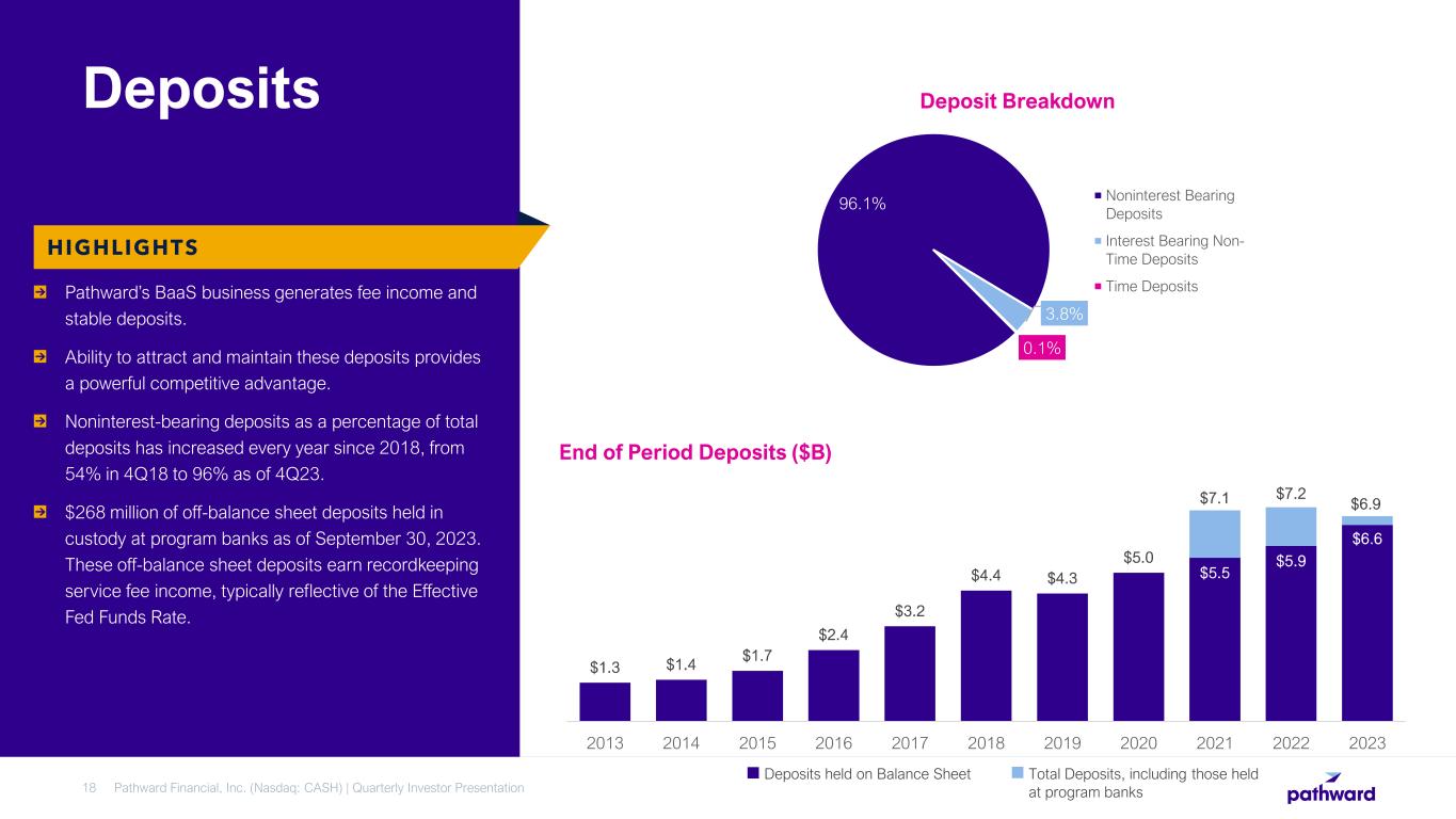 Pathward Financial, Inc. (Nasdaq: CASH) | Quarterly Investor Presentation17 Balance Sheet Highlights Fourth Quarter and Fiscal Year End September 30, 2023 BALANCE SHEET PERIOD ENDING ($ in thousands) 4Q22 3Q23 4Q23 Cash and cash equivalents 388,038 515,271 375,580 Investments 1,924,551 1,951,996 1,840,819 Loans held for sale 21,071 87,351 77,779 Loans and leases (HFI) 3,536,305 4,072,899 4,366,116 Allowance for credit losses (45,947) (81,916) (49,705) Other assets 923,392 913,024 924,954 Total assets 6,747,410 7,458,625 7,535,543 Total deposits 5,866,037 6,306,976 6,589,182 Total borrowings 36,028 264,178 46,873 Other liabilities 200,205 209,750 248,863 Total liabilities 6,102,270 6,780,904 6,884,918 Total stockholders’ equity 645,140 677,721 650,625 Total liabilities and stockholders’ equity 6,747,410 7,458,625 7,535,543 Loans (HFI) / Deposits 60% 65% 66% Net Interest Margin 5.21% 6.18% 6.19% Return on Average Assets 1.39% 2.61% 1.97% Return on Average Equity 12.82% 26.26% 21.12%