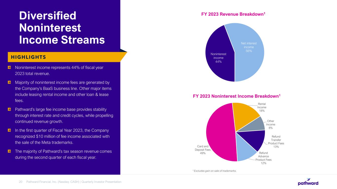 As of September 30, 2023, approximately 49% of the deposit balances were subject to variable card processing expenses, derived from contractual agreements with certain BaaS partners tied to a rate index, typically the Effective Fed Funds Rate. These costs reprice immediately upon a change in the applicable rate index, leading to an instant cost increase as compared to the earning-asset yields that will generally experience a lag in repricing. As of September 30, 2023, Pathward also managed $268 million in off-balance sheet deposits that earned $7.8 million of fee income during the fiscal fourth quarter. That income is also reflective of the Effective Fed Funds Rate. Pathward Financial, Inc. (Nasdaq: CASH) | Quarterly Investor Presentation19 Cost of Deposits HIGHLIGHTS Cost of Deposits 0.12% 1.56% 0.88% 2.22% 0.12% 0.12%0.09% 5.26% 4Q20 1Q21 2Q21 3Q21 4Q21 1Q22 2Q22 3Q22 4Q22 1Q23 2Q23 3Q23 4Q23 All-in Cost of Deposits Cost of Interest Bearing Deposits Cost of Total Deposits Quarterly Average Effective Fed Funds Rate Note: All-in Cost of Deposits represents cost of total deposits with the additional incorporation of the company’s noninterest variable card processing expenses impacted by interest rates.