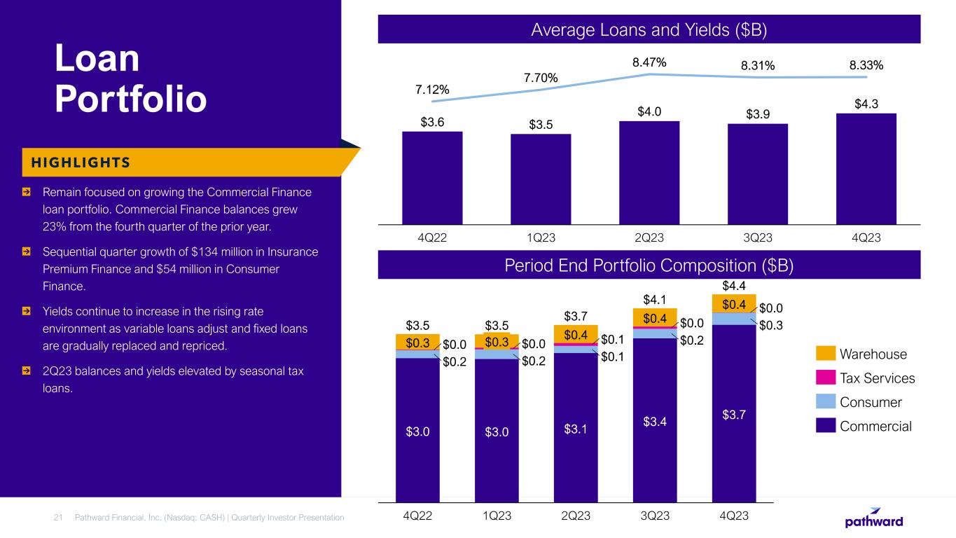 Remain focused on growing the Commercial Finance loan portfolio. Commercial Finance balances grew 23% from the fourth quarter of the prior year. Sequential quarter growth of $134 million in Insurance Premium Finance and $54 million in Consumer Finance. Yields continue to increase in the rising rate environment as variable loans adjust and fixed loans are gradually replaced and repriced. 2Q23 balances and yields elevated by seasonal tax loans. Pathward Financial, Inc. (Nasdaq: CASH) | Quarterly Investor Presentation21 Loan Portfolio HIGHLIGHTS Average Loans and Yields ($B) Period End Portfolio Composition ($B) $3.0 $3.0 $3.1 $3.4 $3.7 $0.2 $0.2 $0.1 $0.2 $0.3 $0.0 $0.0 $0.1 $0.0 $0.0 $0.3 $0.4 $0.4 $0.4 4Q22 $0.3 1Q23 2Q23 3Q23 4Q23 $3.5 $3.5 $3.7 $4.1 $4.4 Warehouse Tax Services Consumer Commercial $3.6 $3.5 $4.0 $3.9 $4.3 7.12% 7.70% 8.47% 8.31% 8.33% 4Q22 1Q23 2Q23 3Q23 4Q23