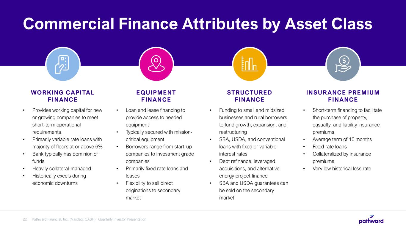 Pathward Financial, Inc. (Nasdaq: CASH) | Quarterly Investor Presentation22 Commercial Finance Attributes by Asset Class WORKING CAPITAL FINANCE • Provides working capital for new or growing companies to meet short-term operational requirements • Primarily variable rate loans with majority of floors at or above 6% • Bank typically has dominion of funds • Heavily collateral-managed • Historically excels during economic downturns EQUIPMENT FINANCE • Loan and lease financing to provide access to needed equipment • Typically secured with mission- critical equipment • Borrowers range from start-up companies to investment grade companies • Primarily fixed rate loans and leases • Flexibility to sell direct originations to secondary market STRUCTURED FINANCE • Funding to small and midsized businesses and rural borrowers to fund growth, expansion, and restructuring • SBA, USDA, and conventional loans with fixed or variable interest rates • Debt refinance, leveraged acquisitions, and alternative energy project finance • SBA and USDA guarantees can be sold on the secondary market INSUR ANCE PREMIUM FINANCE • Short-term financing to facilitate the purchase of property, casualty, and liability insurance premiums • Average term of 10 months • Fixed rate loans • Collateralized by insurance premiums • Very low historical loss rate