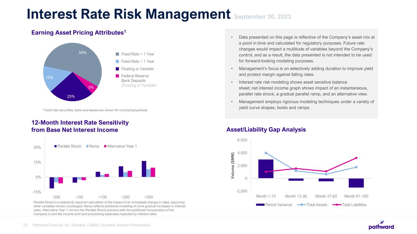 Pathward Financial, Inc. (Nasdaq: CASH) | Quarterly Investor Presentation24 Interest Rate Risk Management September 30, 2023 -2,000 0 2,000 4,000 6,000 Month 1-12 Month 13-36 Month 37-60 Month 61-180 V o lu m e ( $ M M ) Period Variance Total Assets Total Liabilities Asset/Liability Gap Analysis 1 Fixed rate securities, loans and leases are shown for contractual periods. 5% 25% 15% 55% Fixed Rate > 1 Year Earning Asset Pricing Attributes1 Fixed Rate < 1 Year Floating or Variable Federal Reserve Bank Deposits (Floating or Variable) • Data presented on this page is reflective of the Company’s asset mix at a point in time and calculated for regulatory purposes. Future rate changes would impact a multitude of variables beyond the Company’s control, and as a result, the data presented is not intended to be used for forward-looking modeling purposes. • Management’s focus is on selectively adding duration to improve yield and protect margin against falling rates. • Interest rate risk modeling shows asset sensitive balance sheet; net interest income graph shows impact of an instantaneous, parallel rate shock, a gradual parallel ramp, and an alternative view. • Management employs rigorous modeling techniques under a variety of yield curve shapes, twists and ramps. -15% 0% 15% 30% -200 -100 +100 +200 +300 Parallel Shock Ramp Alternative Year 1 12-Month Interest Rate Sensitivity from Base Net Interest Income Parallel Shock is a statutorily required calculation of the impact of an immediate change in rates, assuming other variables remain unchanged. Ramp reflects additional modeling of more gradual increases in interest rates. Alternative Year 1 mirrors the Parallel Shock scenario with the additional incorporation of the Company’s card fee income and card processing expenses impacted by interest rates.