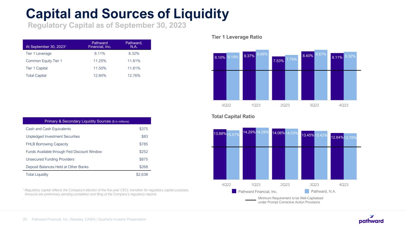 Pathward Financial, Inc. (Nasdaq: CASH) | Quarterly Investor Presentation25 Asset Quality $4.1 $2.2 $6.0 $4.5 $5.2 0.45% 0.25% 0.68% 0.46% 0.49% 0.63% 0.61% 0.46% 0.46% 0.47% 4Q22 1Q23 2Q23 3Q23 4Q23 Period Ended Adj. NCOs Adj. NCOs / Adj. Average Loans Adj. NCOs / Adj. Average Loans - LTM Adjusted Net Charge-Offs (“NCOs”)1 Excludes Tax Services NCOs and Related Seasonal Average Loans ($ in millions) KEY CREDIT METRICS • Annualized adjusted net charge-offs1: – 0.49% of average loans in 4Q23 – 0.47% of average loans over last 12 months • Allowance for credit loss (“ACL”) of $49.7 million as of September 30, 2023. • ACL as a % of total loans and leases was 1.14% for 4Q23, a 16 bps decrease from the prior year. • The increase in NPAs / NPLs compared to the sequential quarter was driven by an increase within the commercial finance portfolio and the seasonal tax services portfolio. $30.9 $45.0 $30.1 $40.8 $58.0 0.46% 0.68% 0.44% 0.55% 0.77% 4Q22 1Q23 2Q23 3Q23 4Q23 Period Ended NPAs NPAs / Total Assets 1 Non-GAAP financial measures, see appendix for reconciliations. Tax services NCOs and related seasonal average loans are excluded to adjust for the cyclicality of activity related to the overall economics of the tax services business line. $29.2 $40.9 $28.5 $38.8 $56.2 0.82% 1.16% 0.76% 0.93% 1.26% 4Q22 1Q23 2Q23 3Q23 4Q23 Period Ended NPLs NPLs / Total Loans Nonperforming Assets (“NPAs”) ($ in millions) Nonperforming Loans (“NPLs”) ($ in millions)